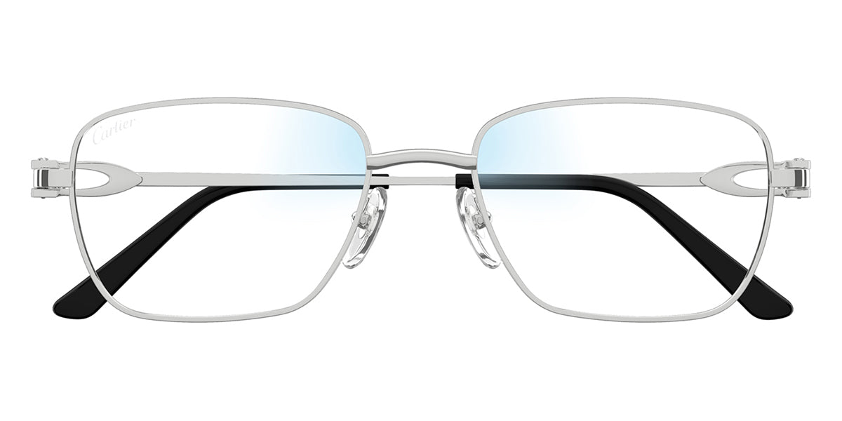 This square Cartier sunglass comes in a silver frame with clear blue control to dark grey photochromic lenses.