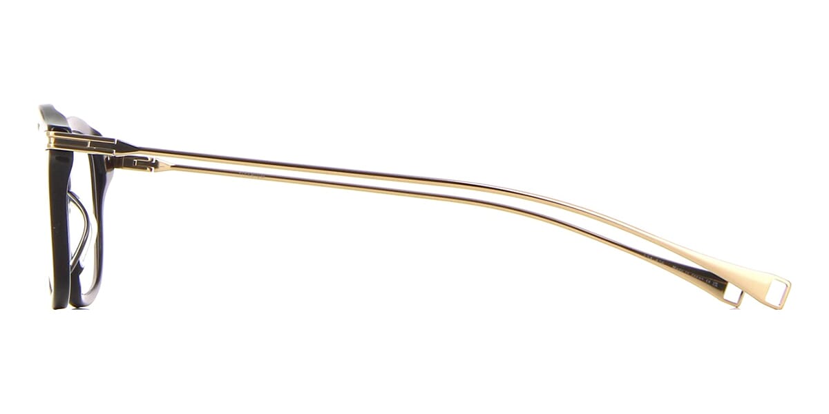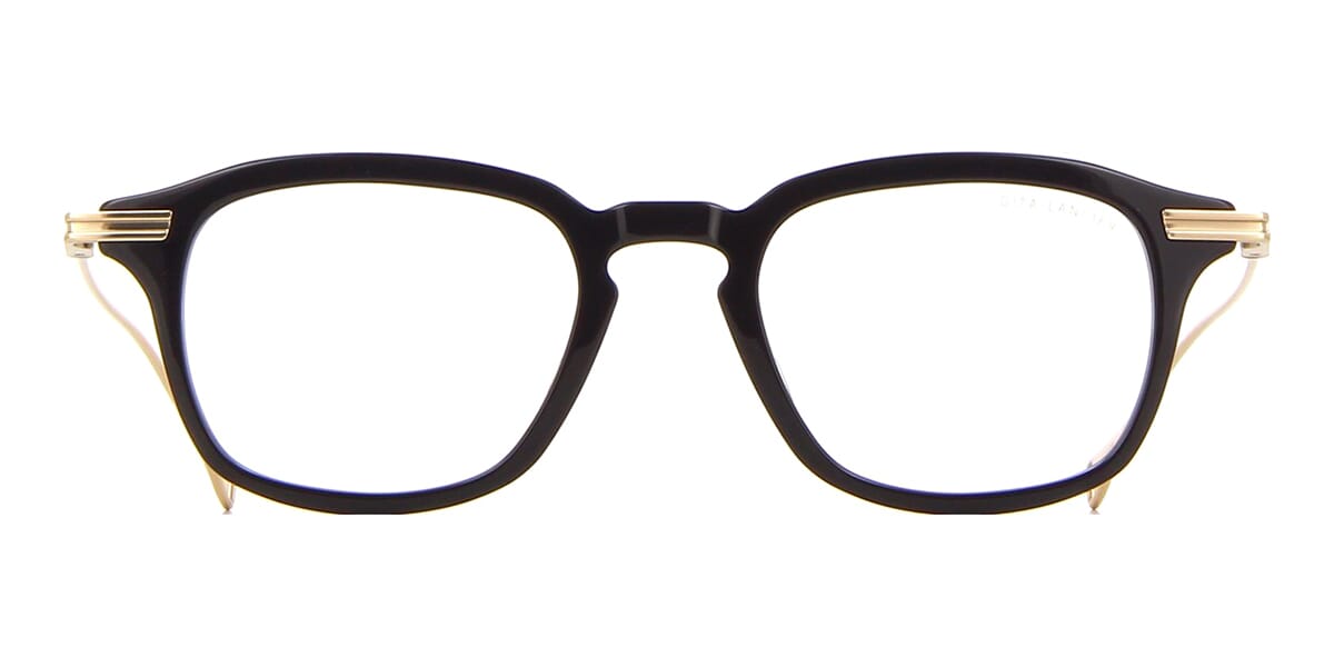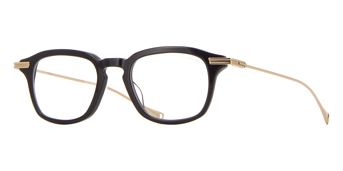 This square Dita Lancier optical comes in a shiny black and gold sand frame.