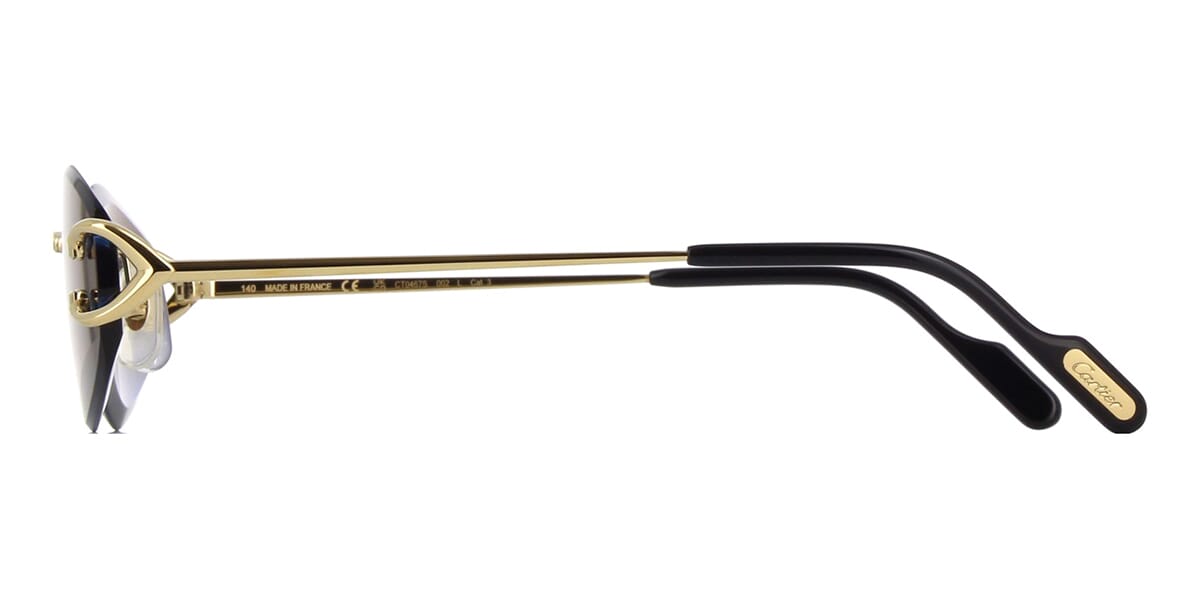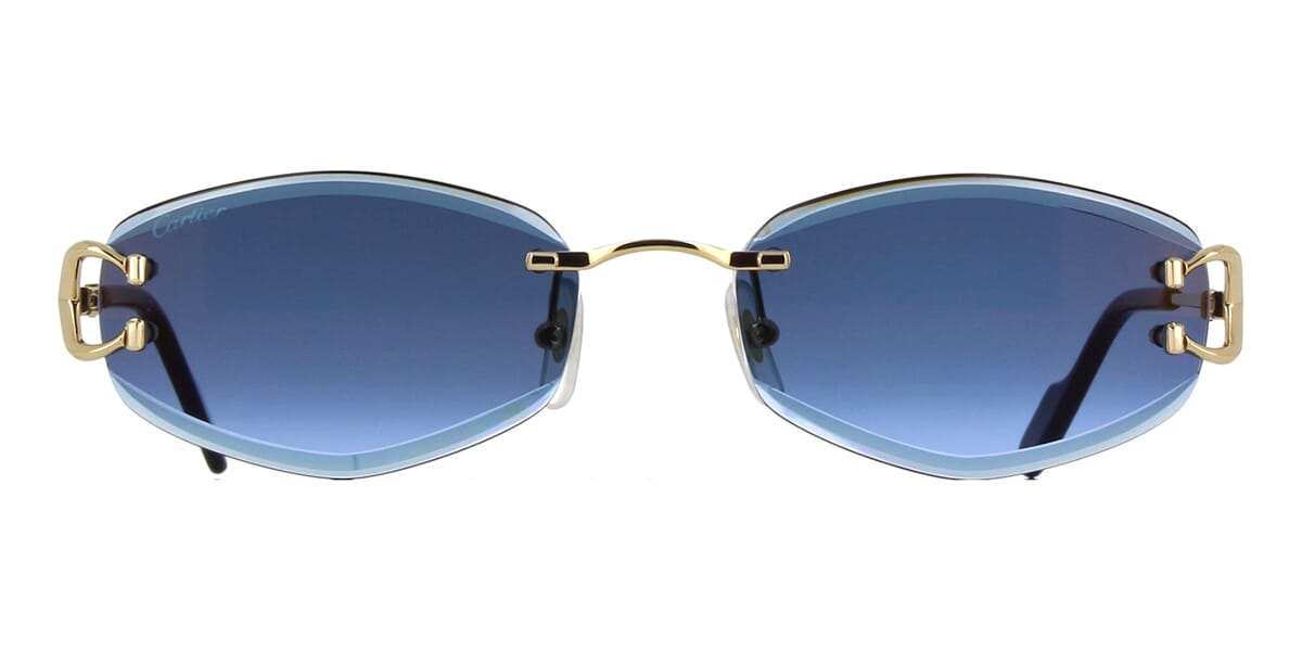 This cat eye Cartier sunglass comes in a shiny gold frame with blue gradient lenses.