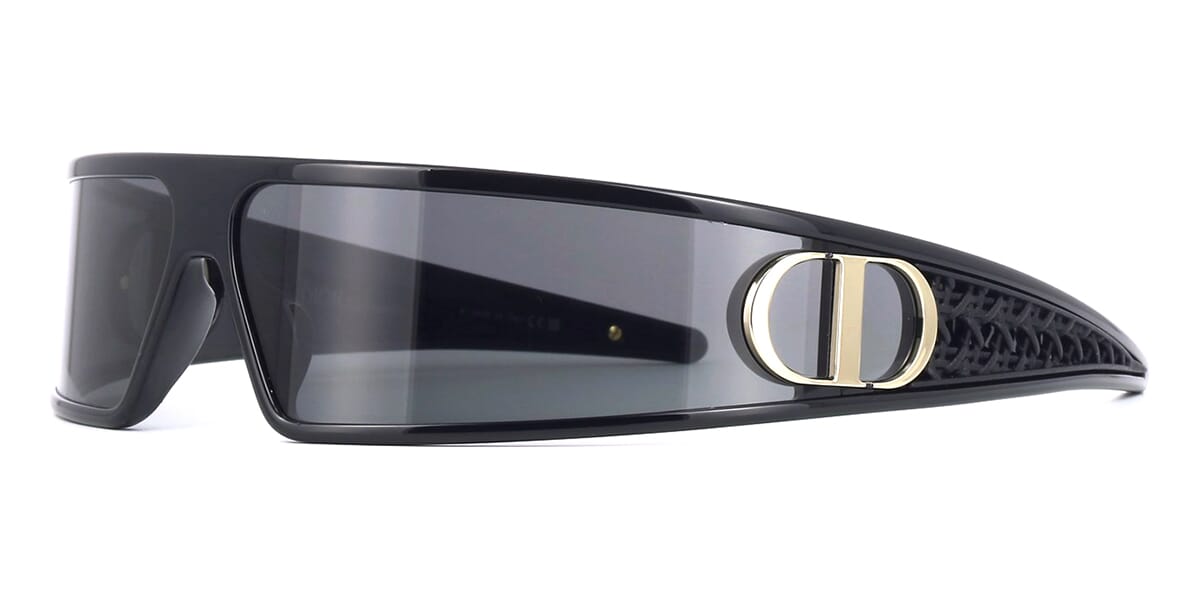 This wraparound Dior sunglass comes in a shiny black frame with grey with light mirror lenses.