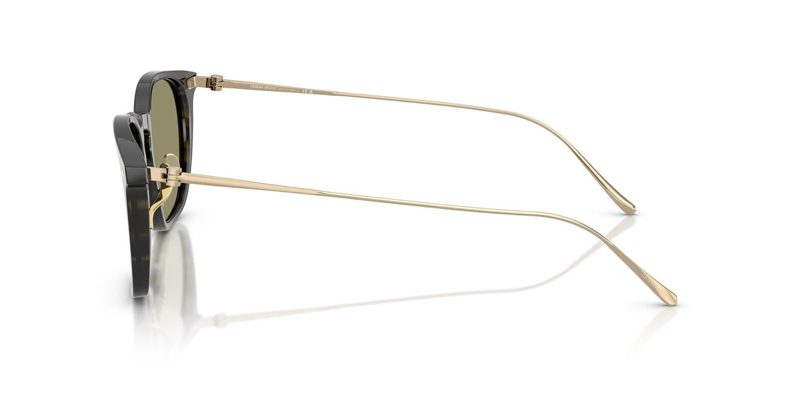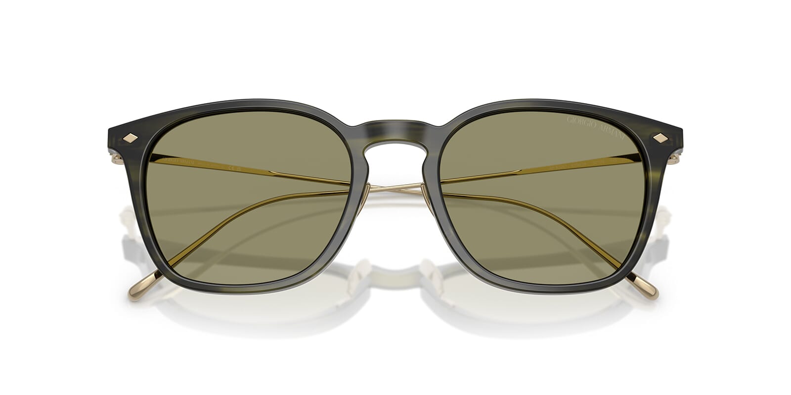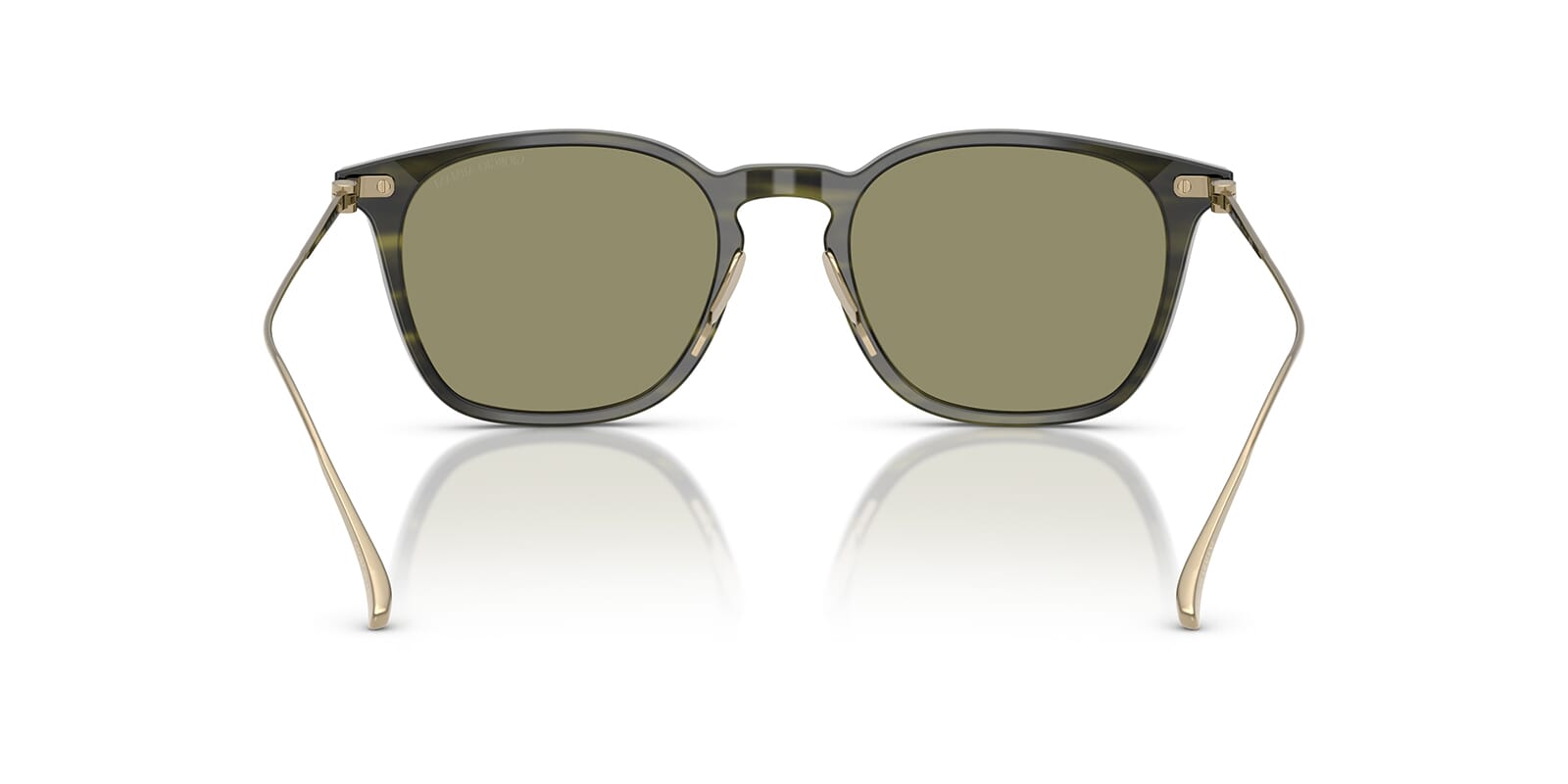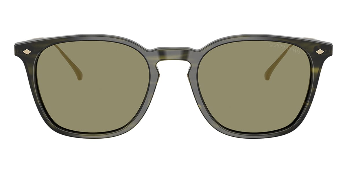 This square Giorgio Armani sunglass comes in a striped green frame with green lenses.