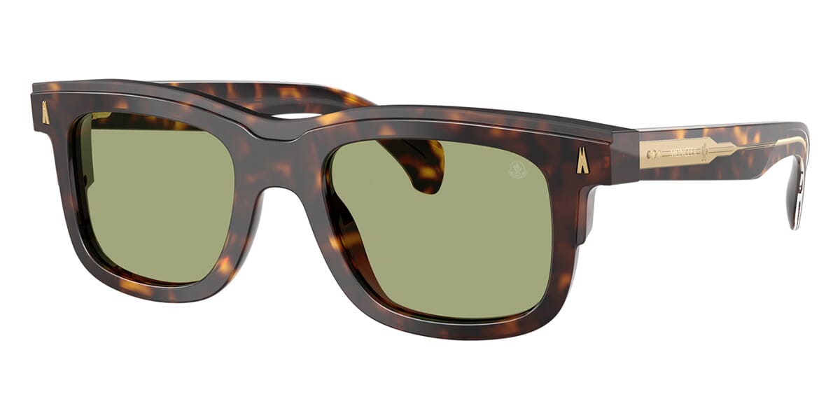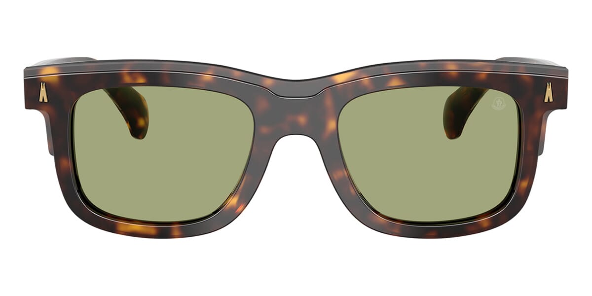 This square Moncler sunglass comes in a brown tortoise frame with green lenses.