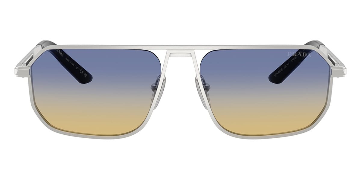 This rectangular Prada sunglass comes in a matte silver frame with yellow and dark blue lenses.