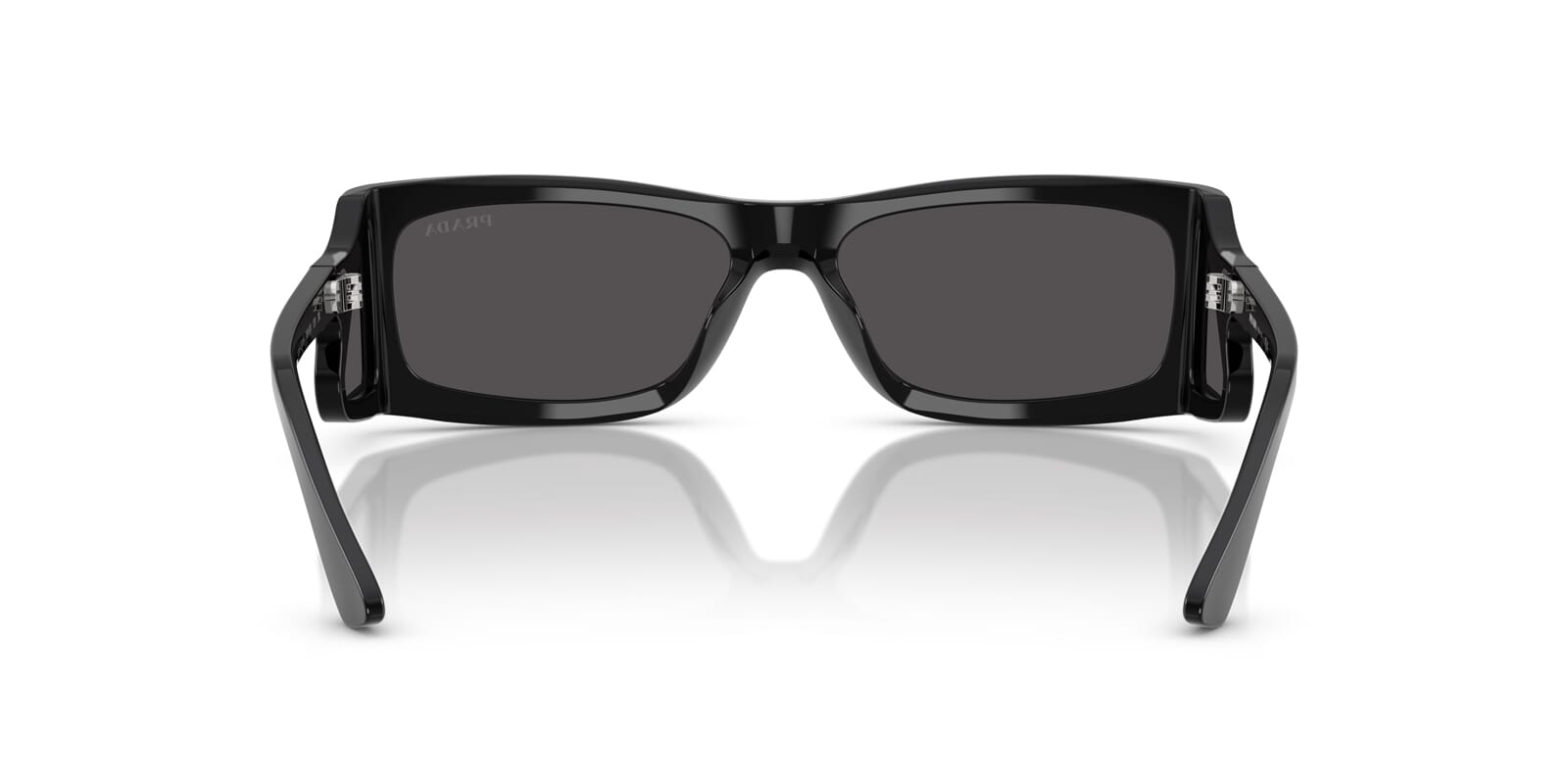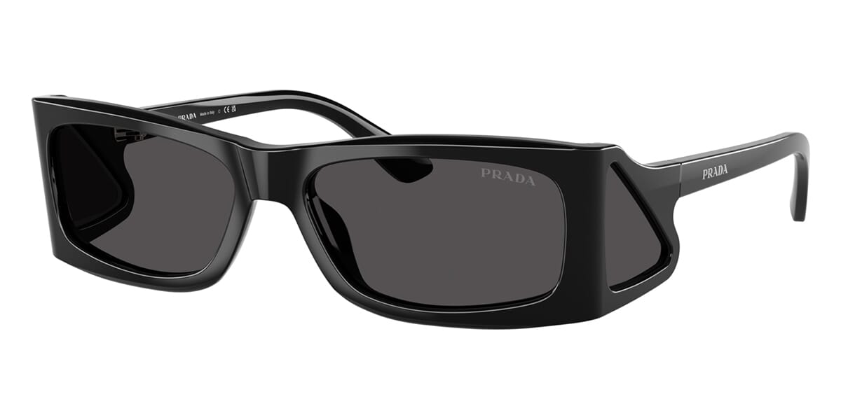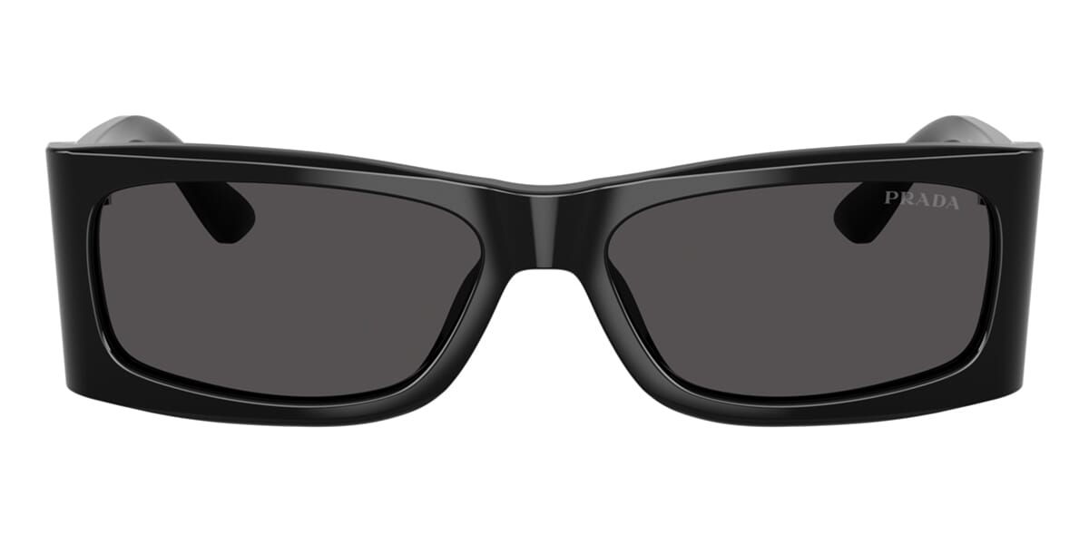 This rectangular Prada sunglass comes in a black frame with dark grey lenses.
