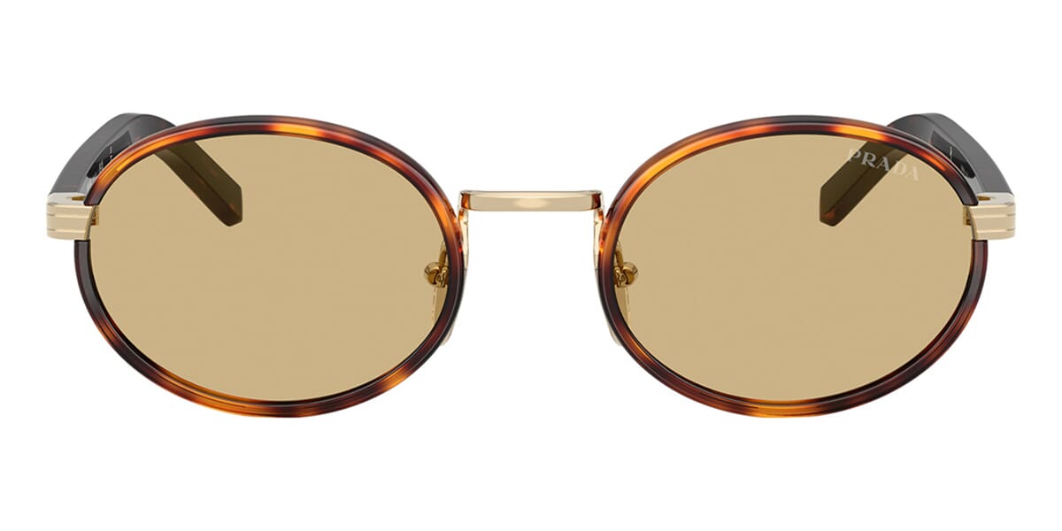 This round Prada sunglass comes in a root tortoise frame with organic chamomile lenses.