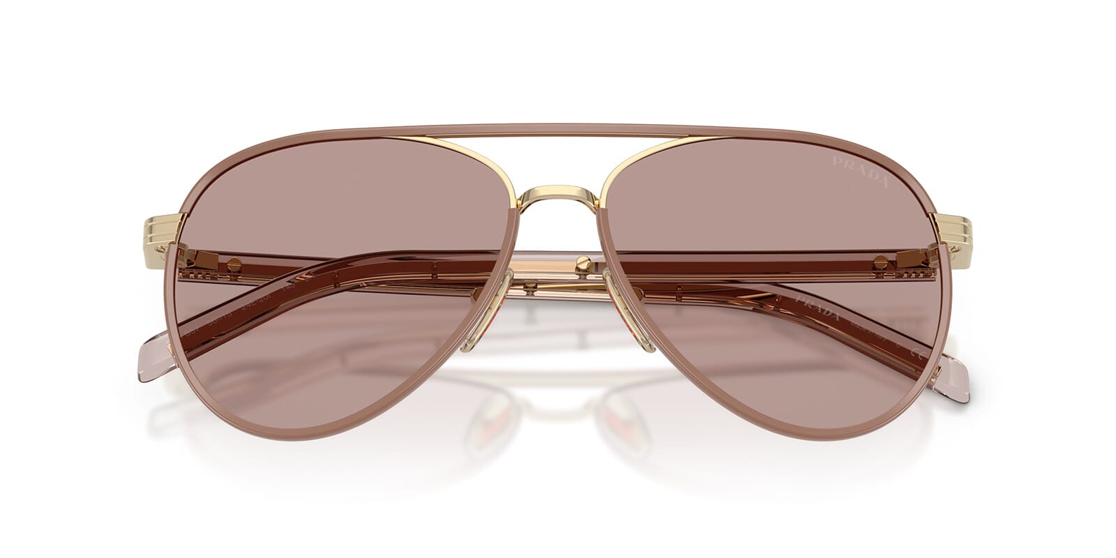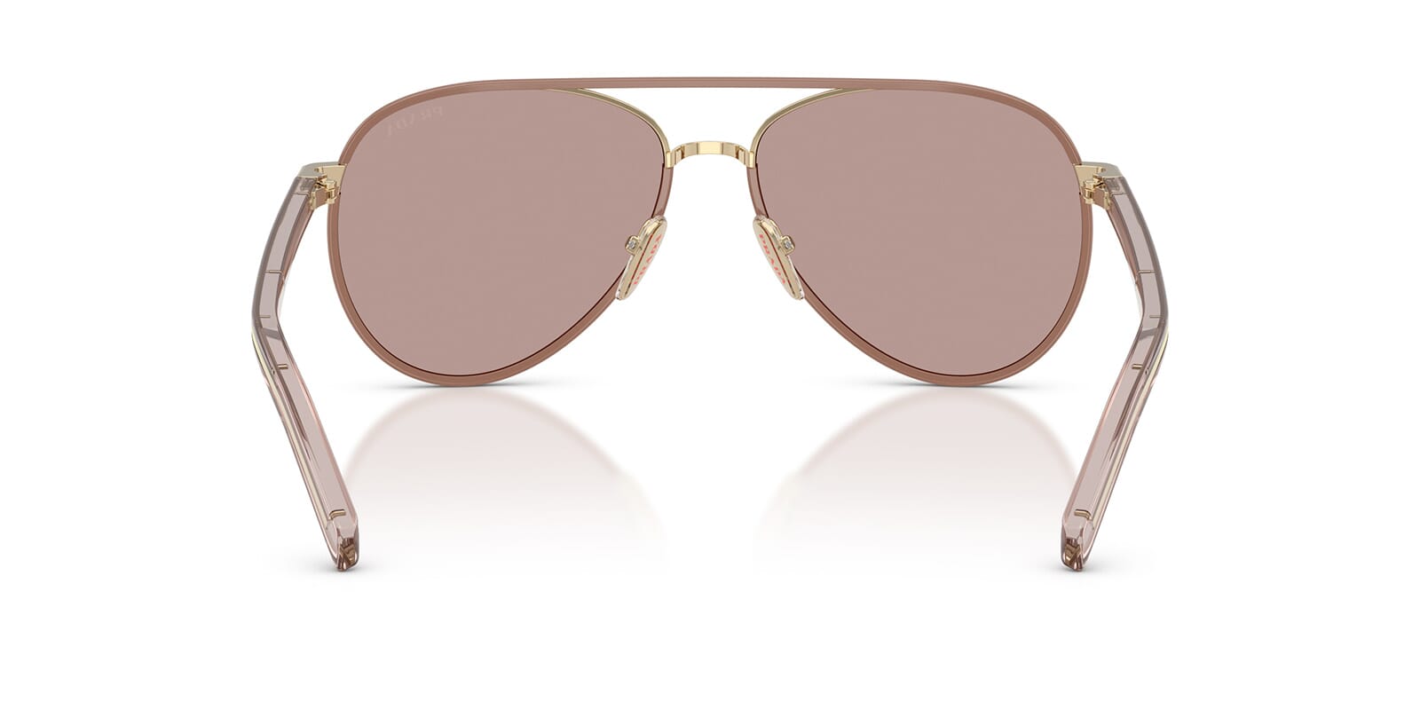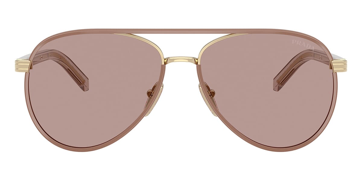 This aviator Prada sunglass comes in a pale gold frame with light purple brown lenses.