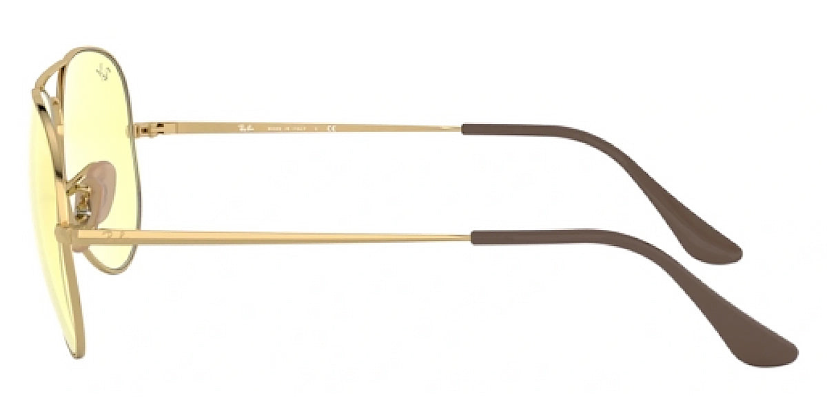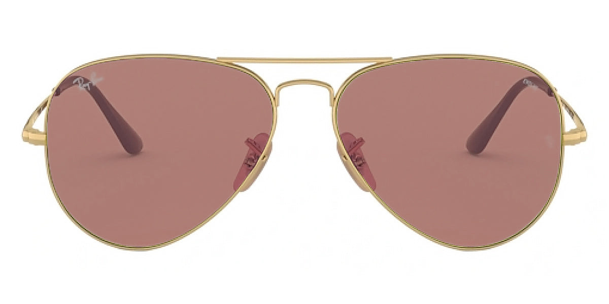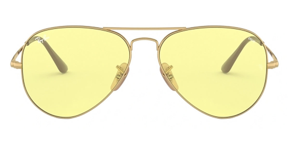 This aviator Ray-Ban sunglass comes in an arista gold frame with yellow to red photochromic lenses.