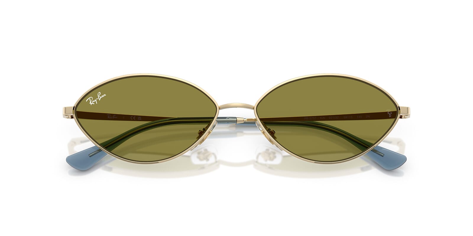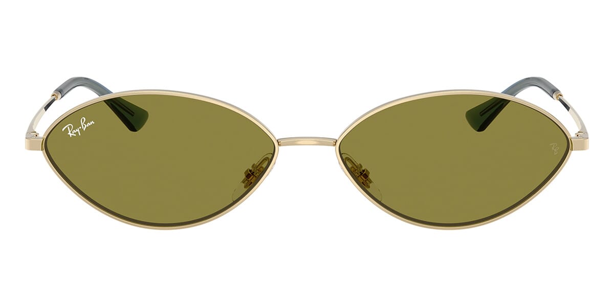 This round Ray-Ban sunglass comes in a pale gold frame with green lenses.