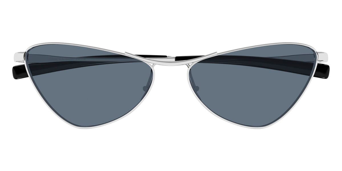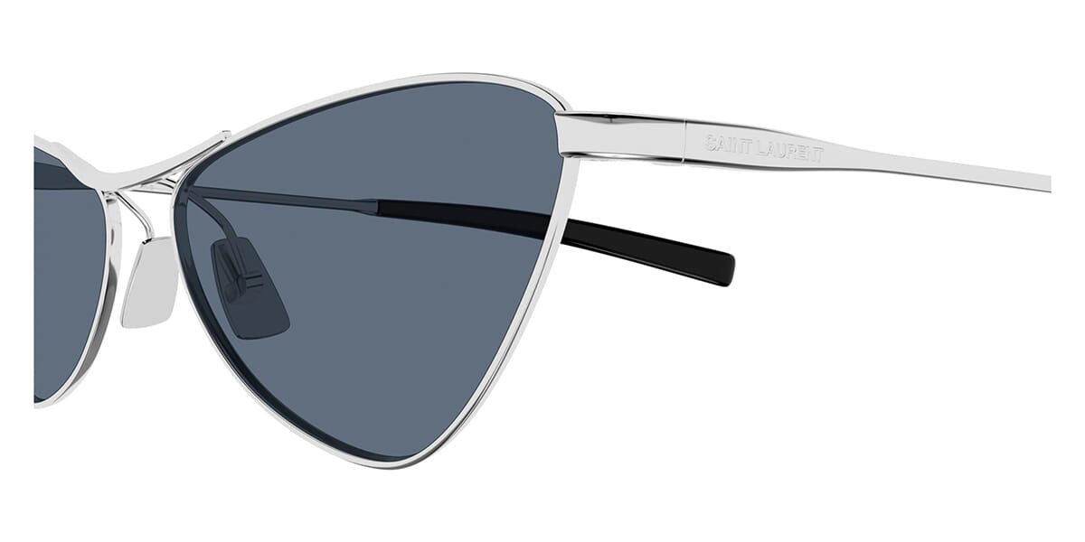 This cat eye Saint Laurent sunglass comes in a silver frame with blue lenses.