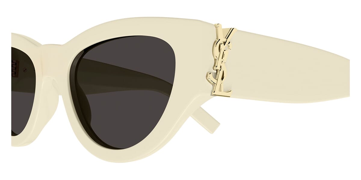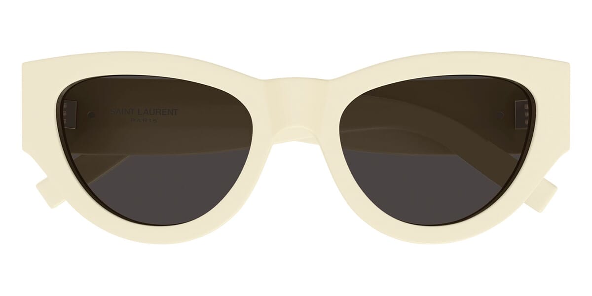 This square Saint Laurent sunglass comes in a ivory with gold frame with grey lenses.