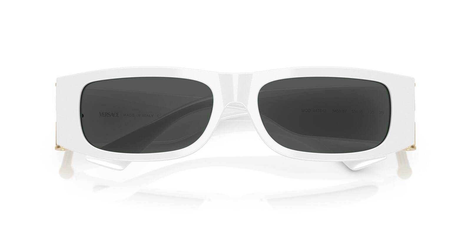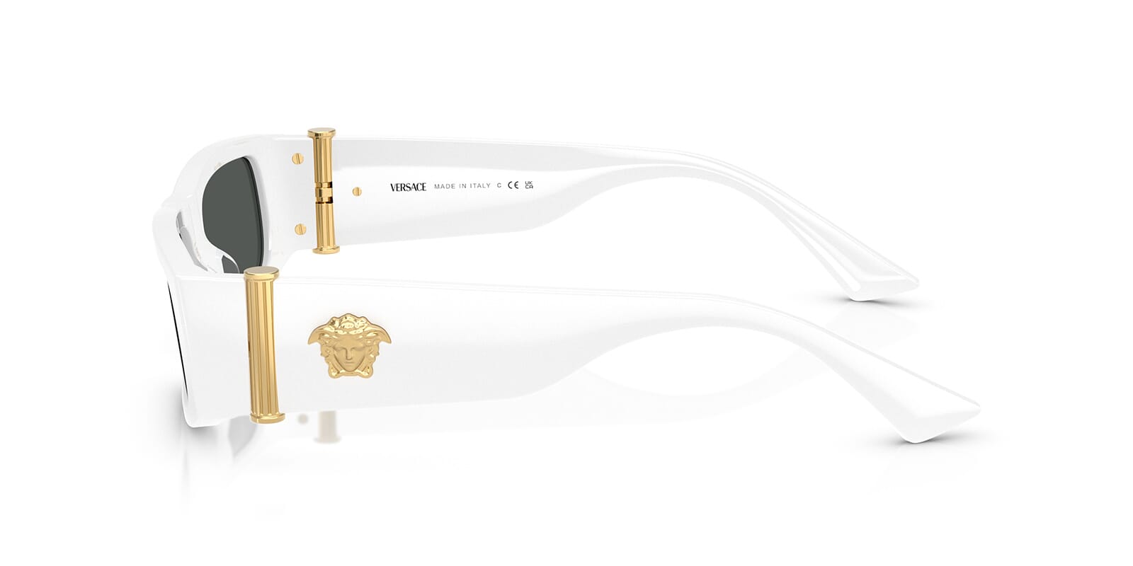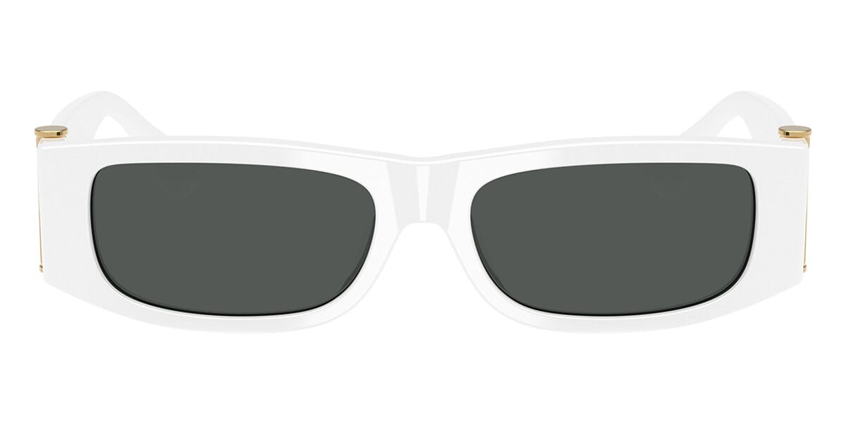 This rectangular Versace sunglass comes in a white frame with dark grey lenses.