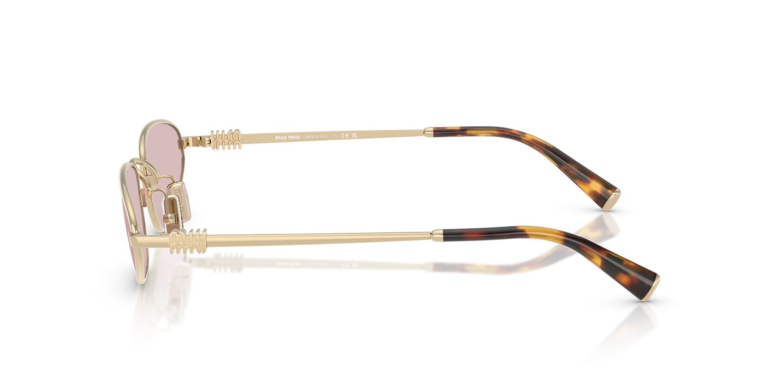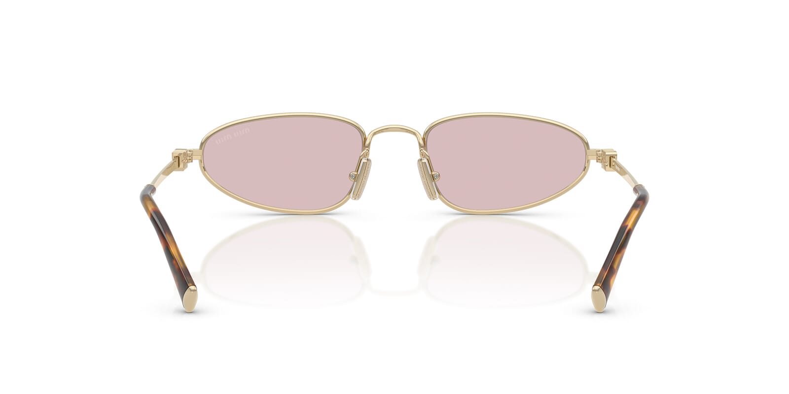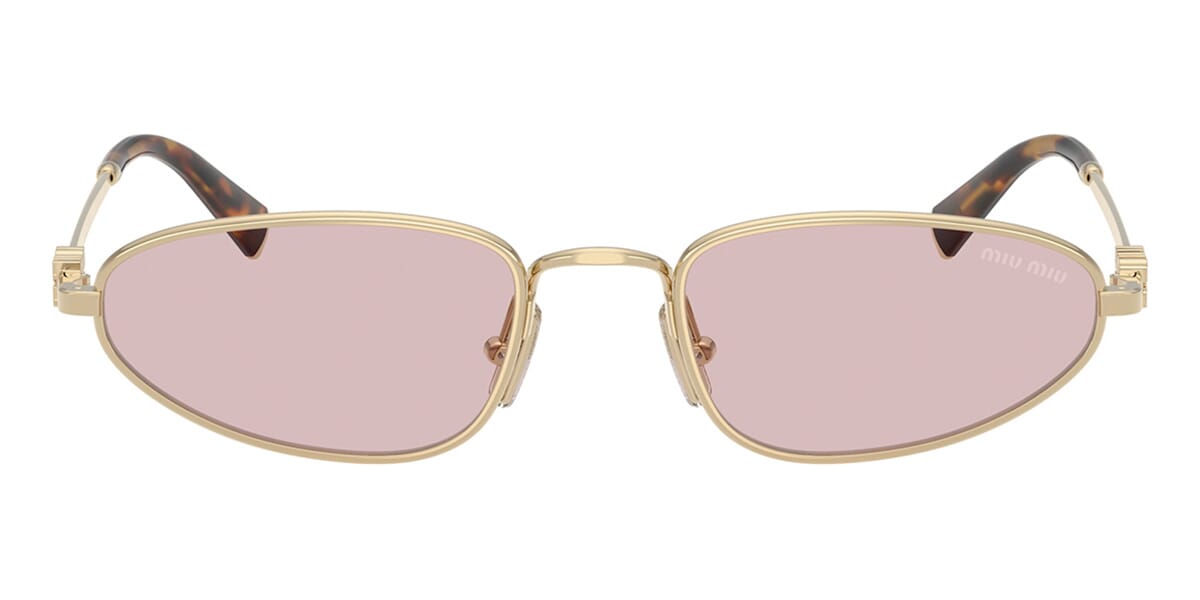 This rectangular Miu Miu sunglass comes in a pale gold frame with pink lenses.