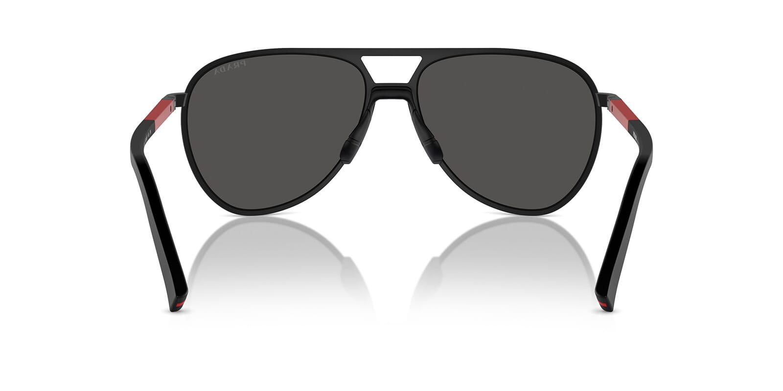 This aviator Prada Linea Rossa sunglass comes in a matte black frame with dark grey lenses.