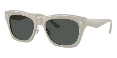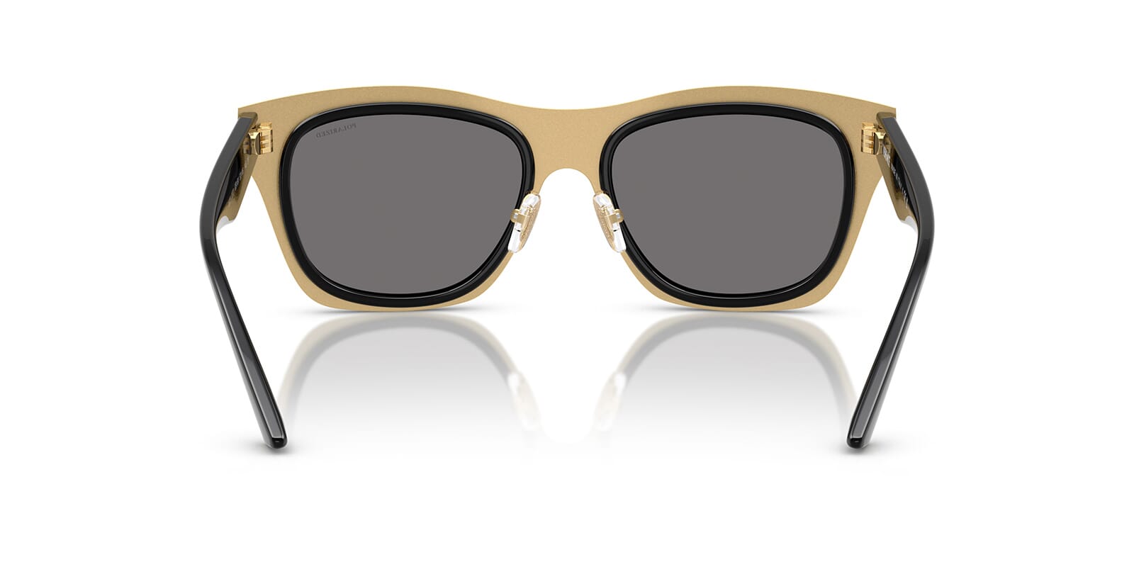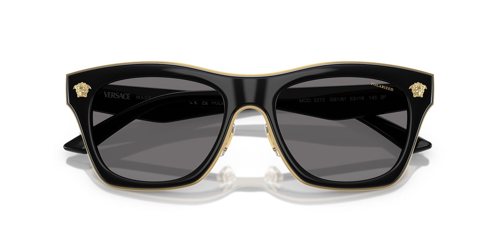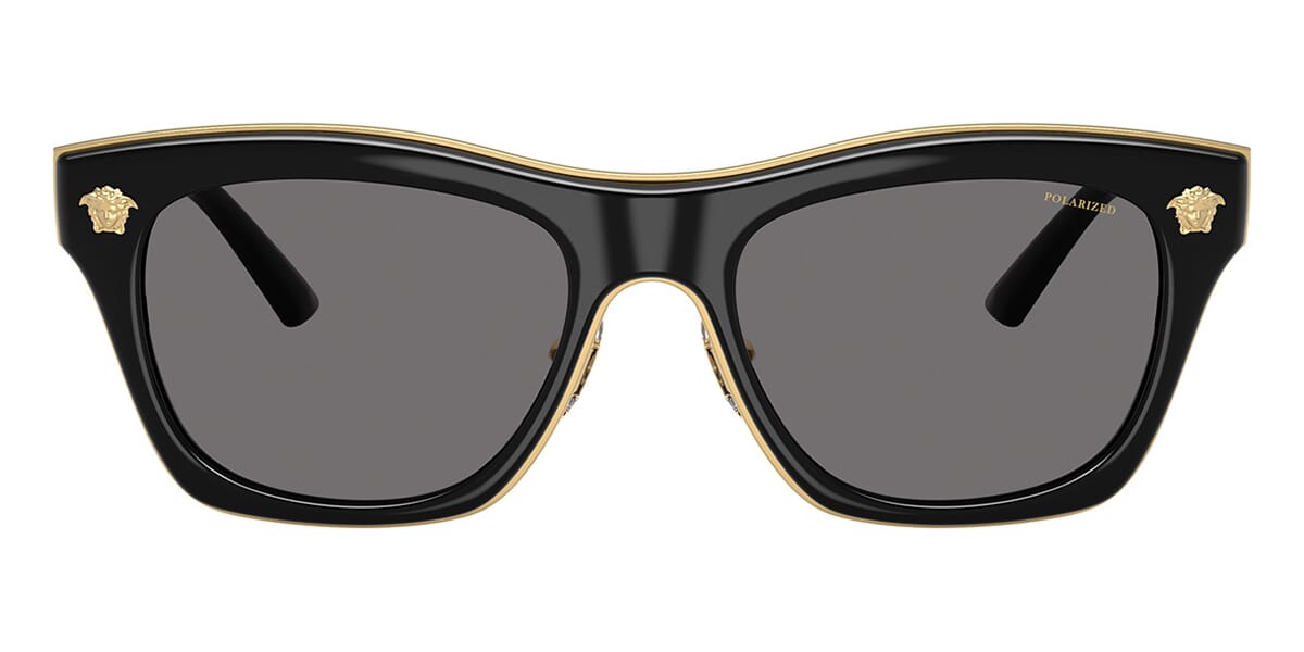 This rectangular Versace sunglass comes in a black frame with dark grey polarised lenses.