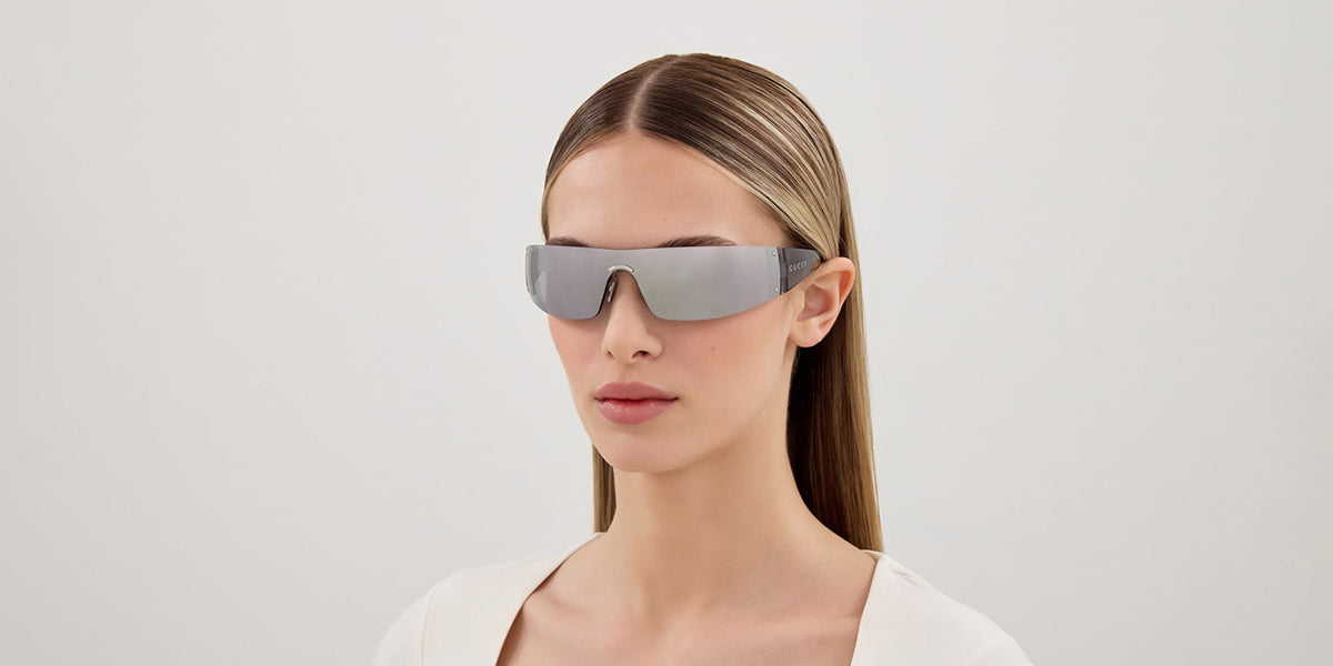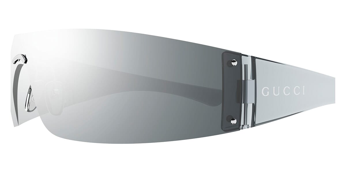 This wraparound Gucci sunglass comes in a shiny silver frame with grey with light mirror lenses.