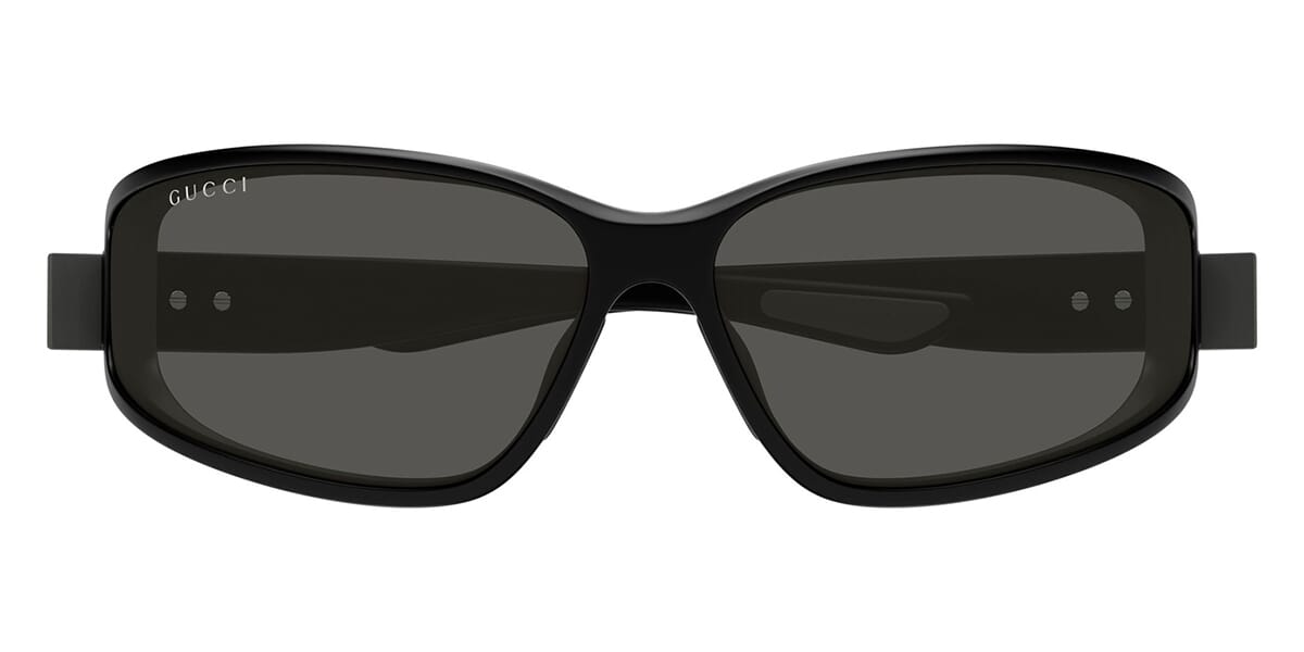 This wraparound Gucci sunglass comes in a matte black frame with grey with light mirror lenses.