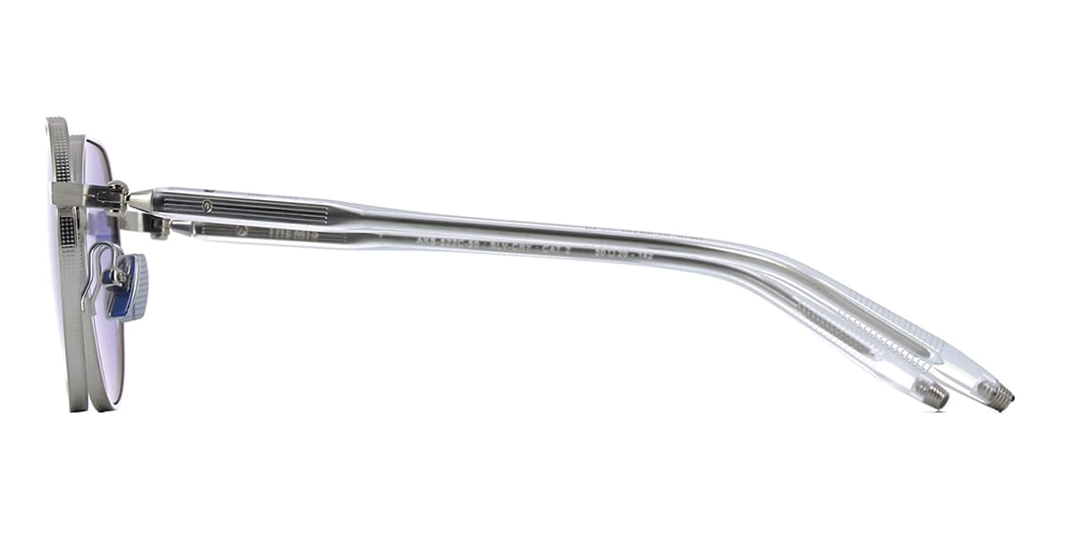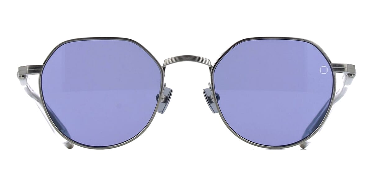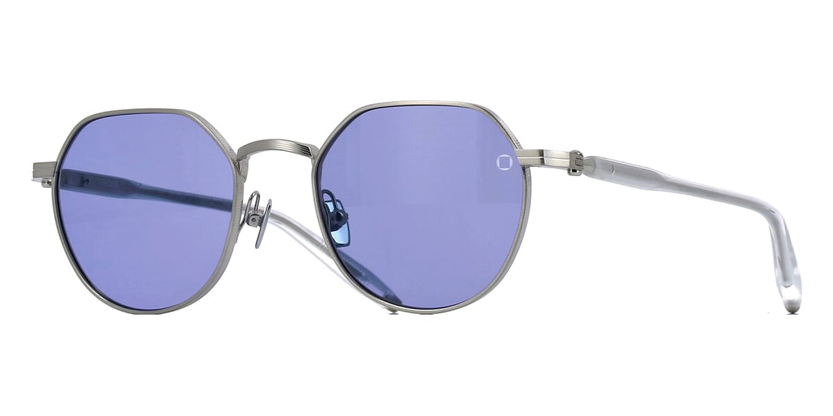 This round Akoni sunglass comes in a brushed silver and crystal frame with blue with light mirror lenses.