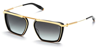 This square Akoni sunglass comes in a shiny black with gold frame with gradient dark grey with light grey lenses.
