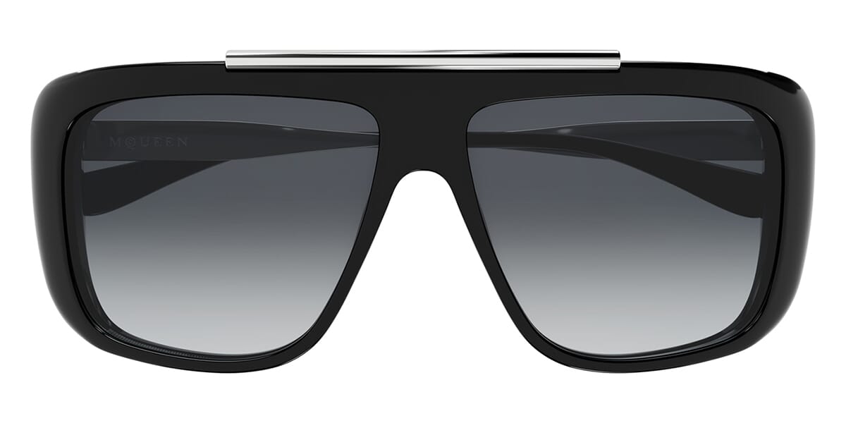 This aviator Alexander McQueen sunglass comes in a black with silver frame with grey gradient lenses.