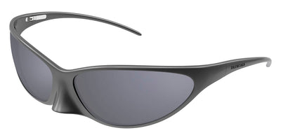 This cat eye Balenciaga sunglass comes in a shiny black frame with grey with light mirror lenses.