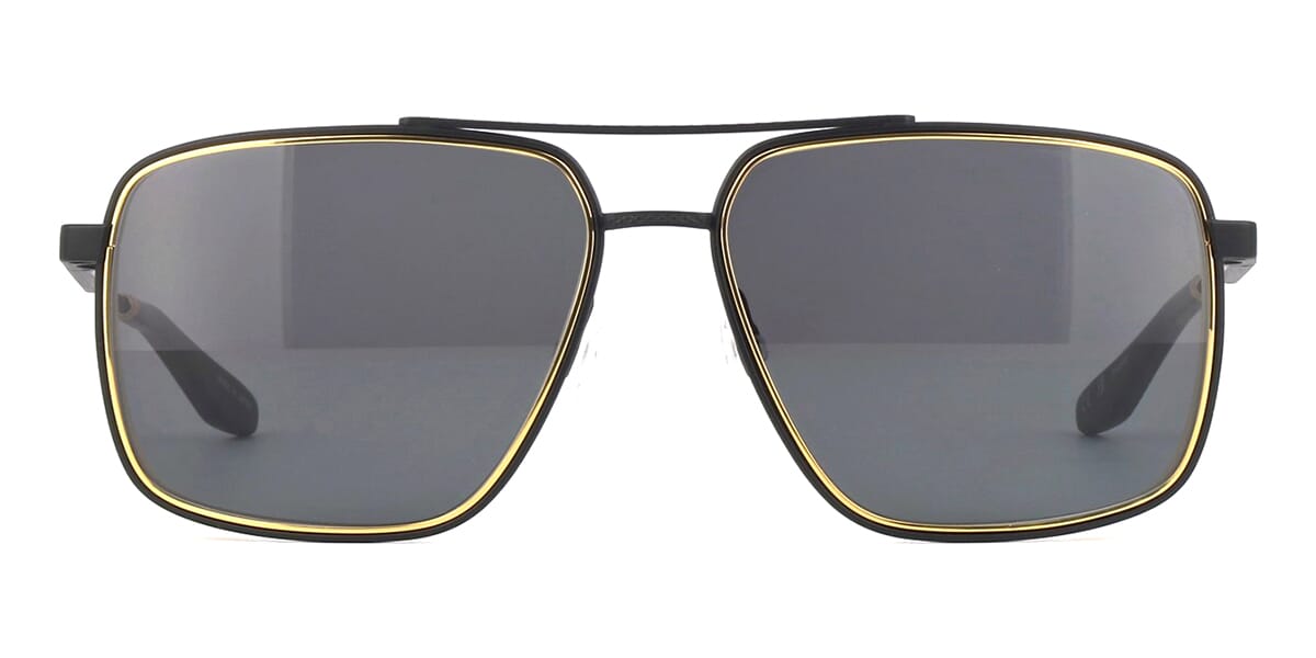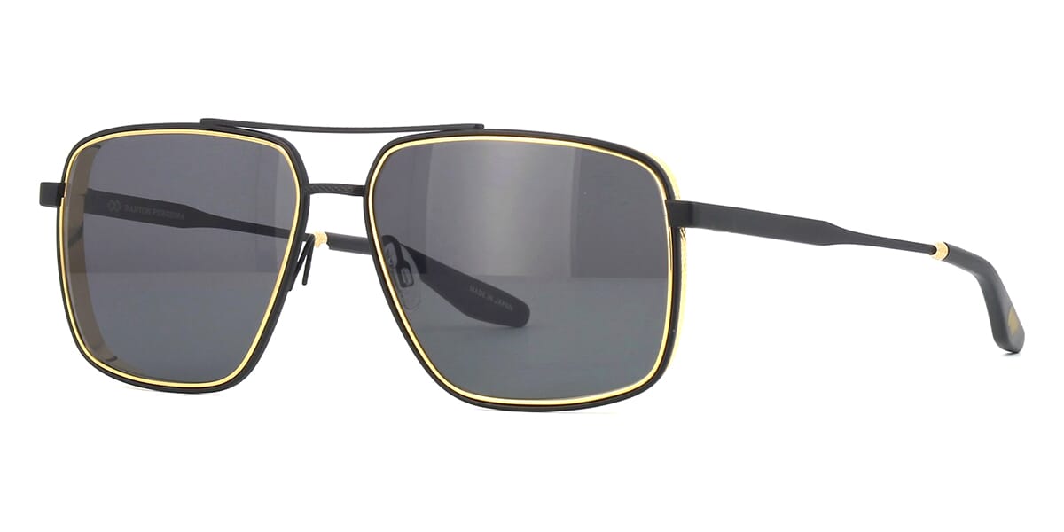 This square Barton Perreira sunglass comes in a matte black and 24k gold plated including gold special edition golden gun bullet keyring frame with grey with light mirror lenses.