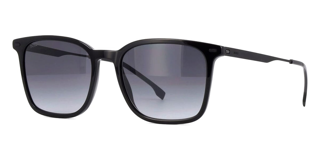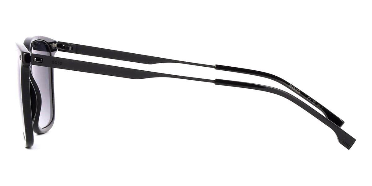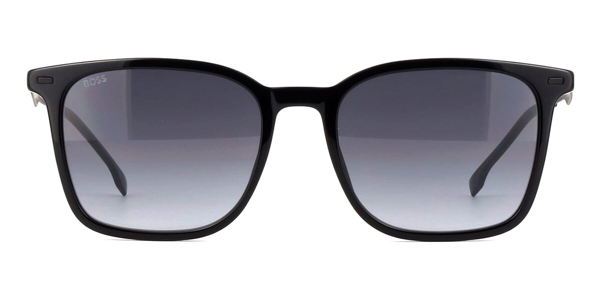 This square Hugo Boss sunglass comes in a shiny black frame with grey gradient lenses.