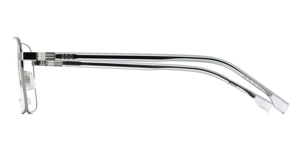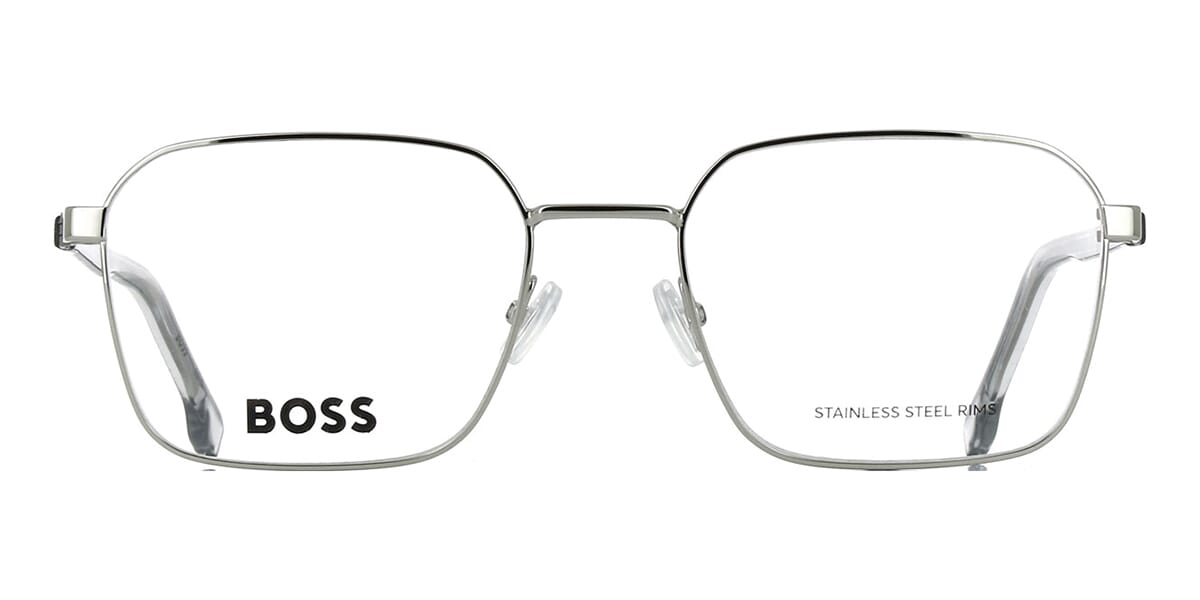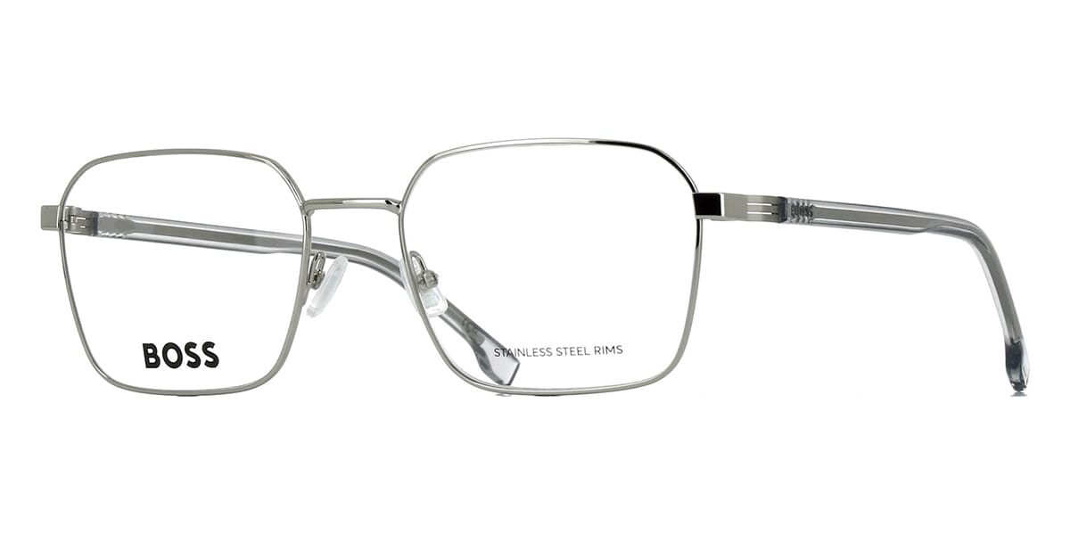 This square Hugo Boss optical comes in a shiny palladium and grey frame.