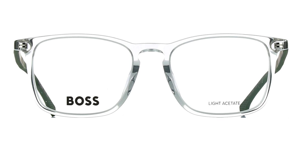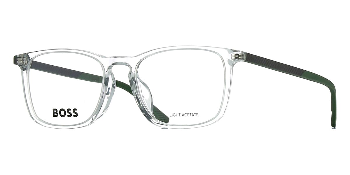 This square Hugo Boss optical comes in a grey crystal frame.
