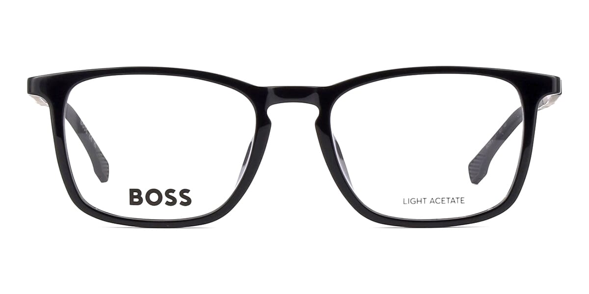 This square Hugo Boss optical comes in a shiny black and matte frame.