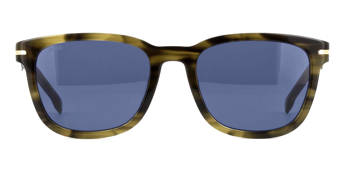 This square Hugo Boss sunglass comes in a shiny green havana frame with grey lenses.