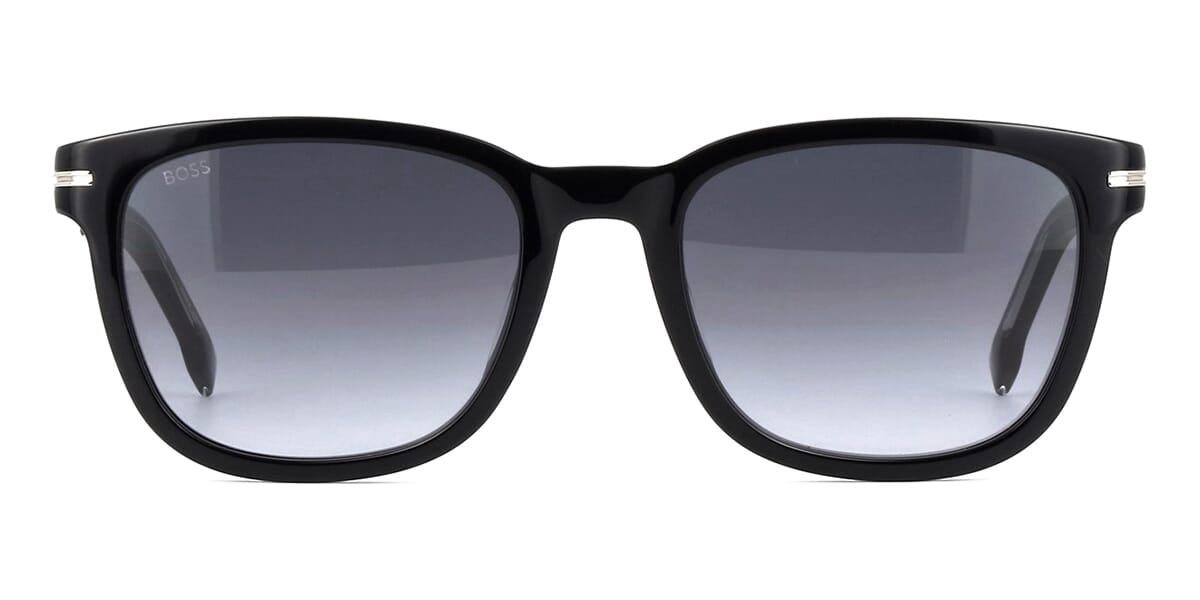 This square Hugo Boss sunglass comes in a shiny black frame with grey gradient with light mirror lenses.