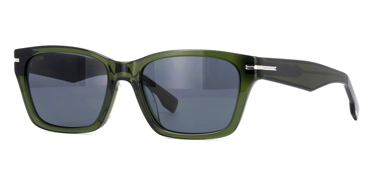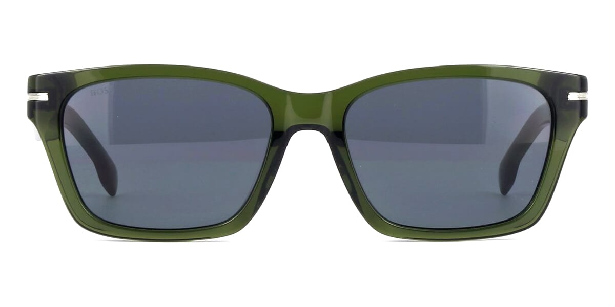 This square Hugo Boss sunglass comes in a shiny dark green crystal frame with grey lenses.