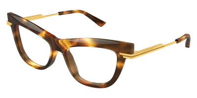 This square Bottega Veneta optical comes in a havana with gold frame.