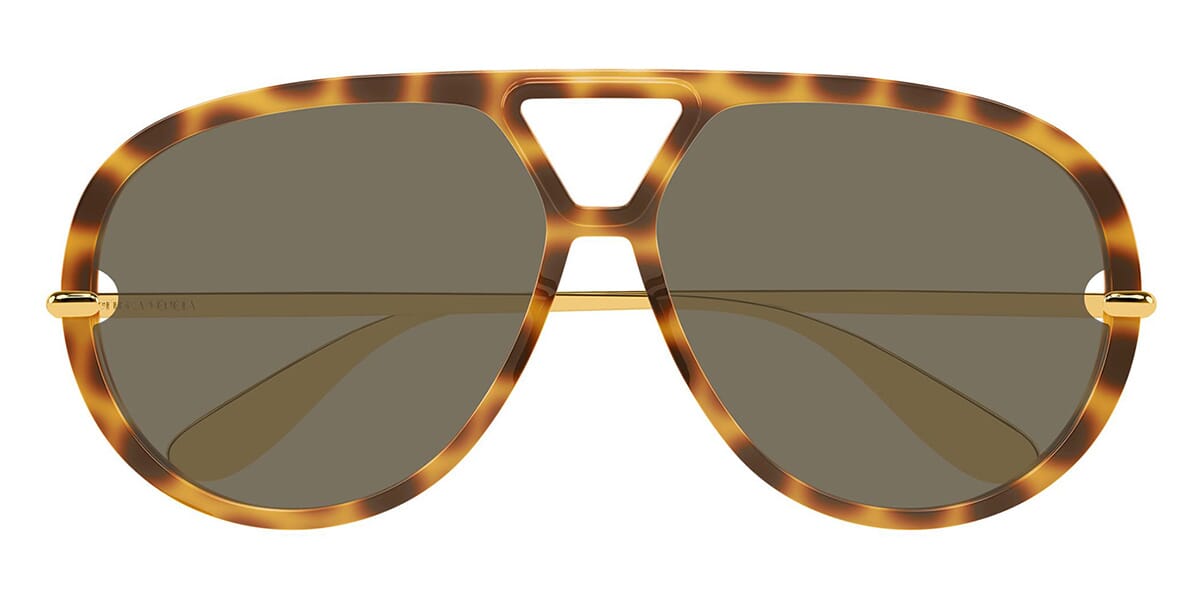 This aviator Bottega Veneta sunglass comes in a havana and gold frame with brown lenses.