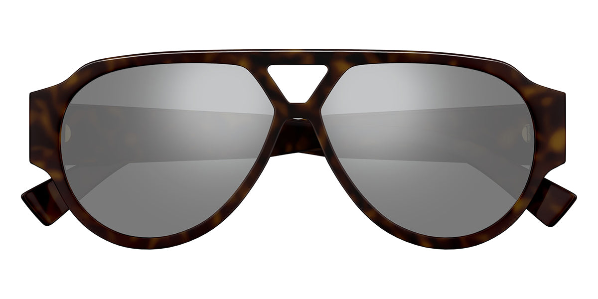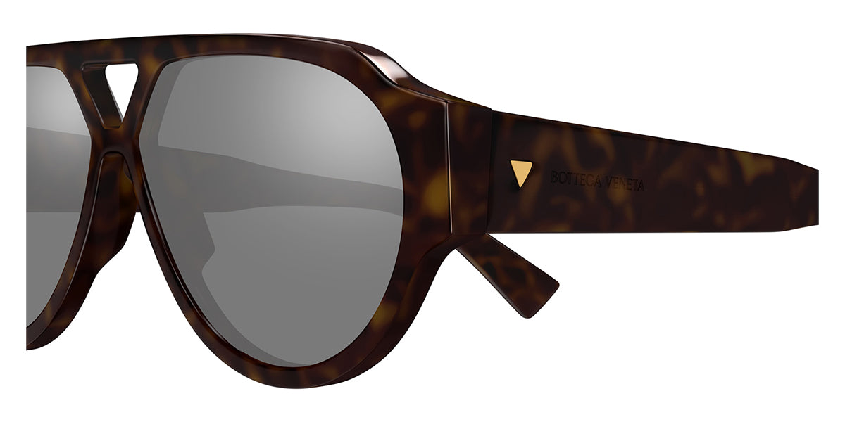 This aviator Bottega Veneta sunglass comes in a shiny dark havana frame with grey with silver flash mirror lenses.