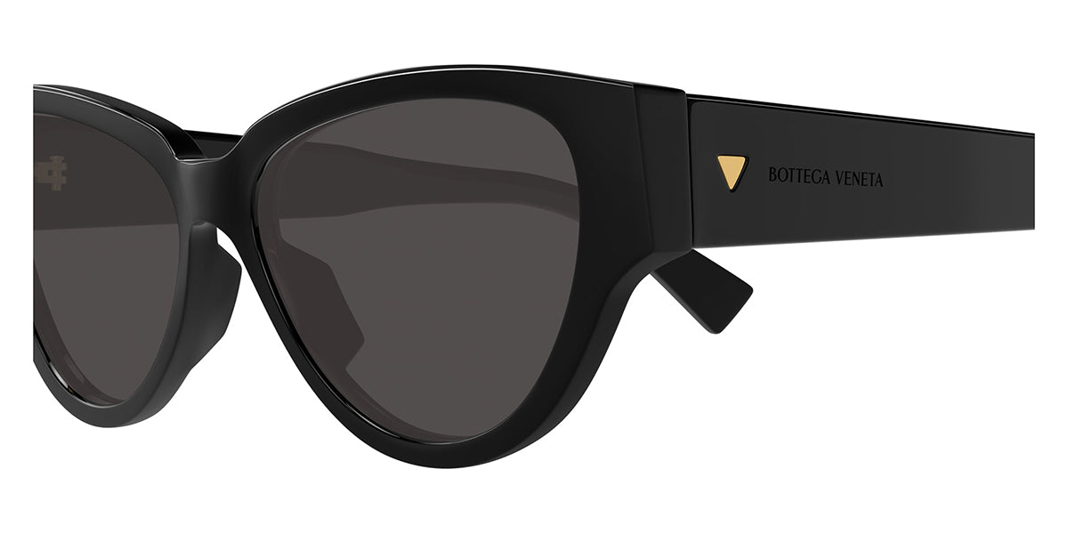 This cat eye Bottega Veneta sunglass comes in a shiny black frame with grey with light mirror lenses.