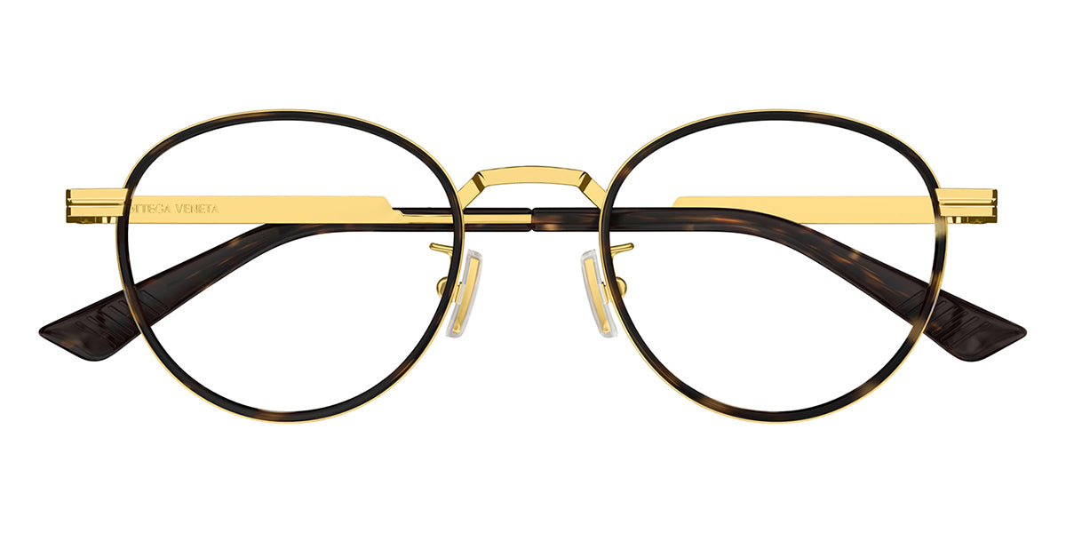 This round Bottega Veneta optical comes in a shiny havana on gold frame.