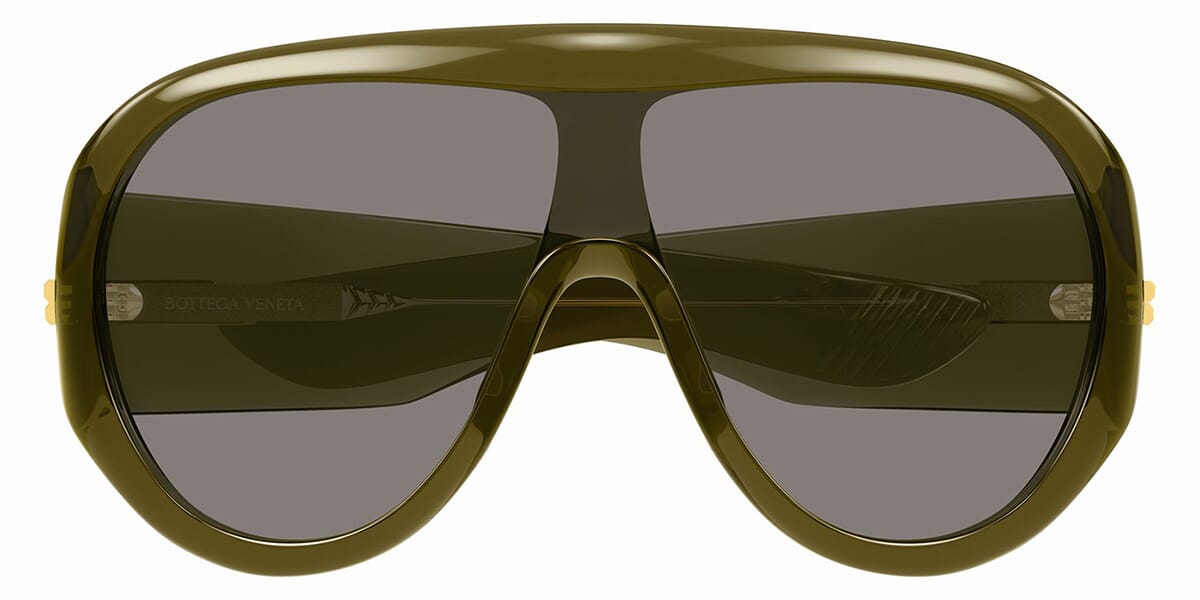 This shield Bottega Veneta sunglass comes in a green frame with grey lenses.