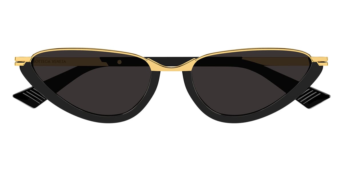 This cat eye Bottega Veneta sunglass comes in a shiny black frame with grey lenses.