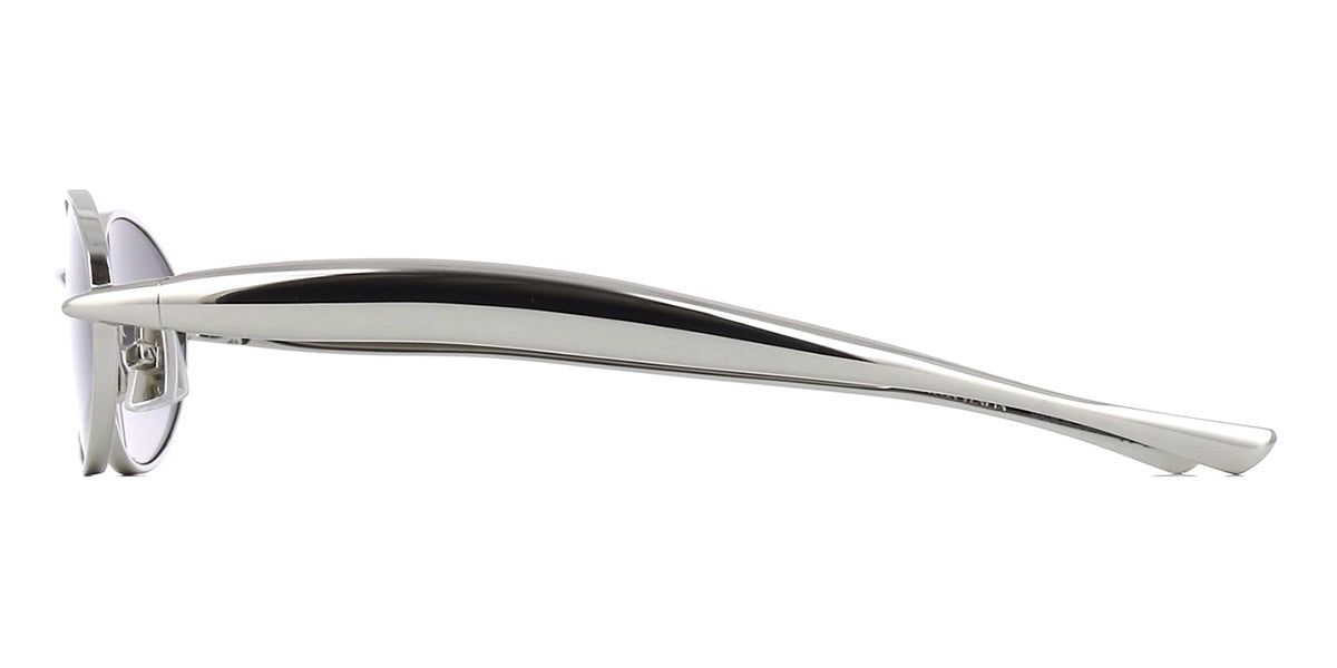 This square Bottega Veneta sunglass comes in a shiny silver frame with grey lenses.