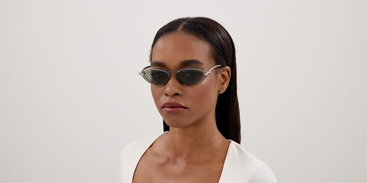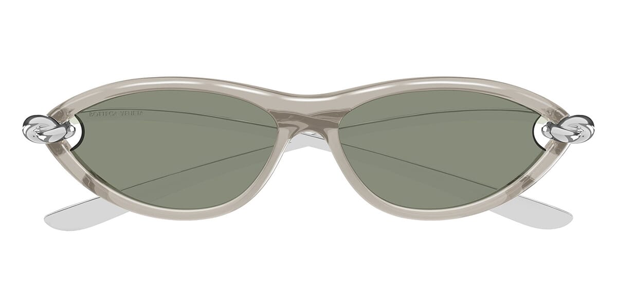 This cat eye Bottega Veneta sunglass comes in a beige and silver frame with green lenses.