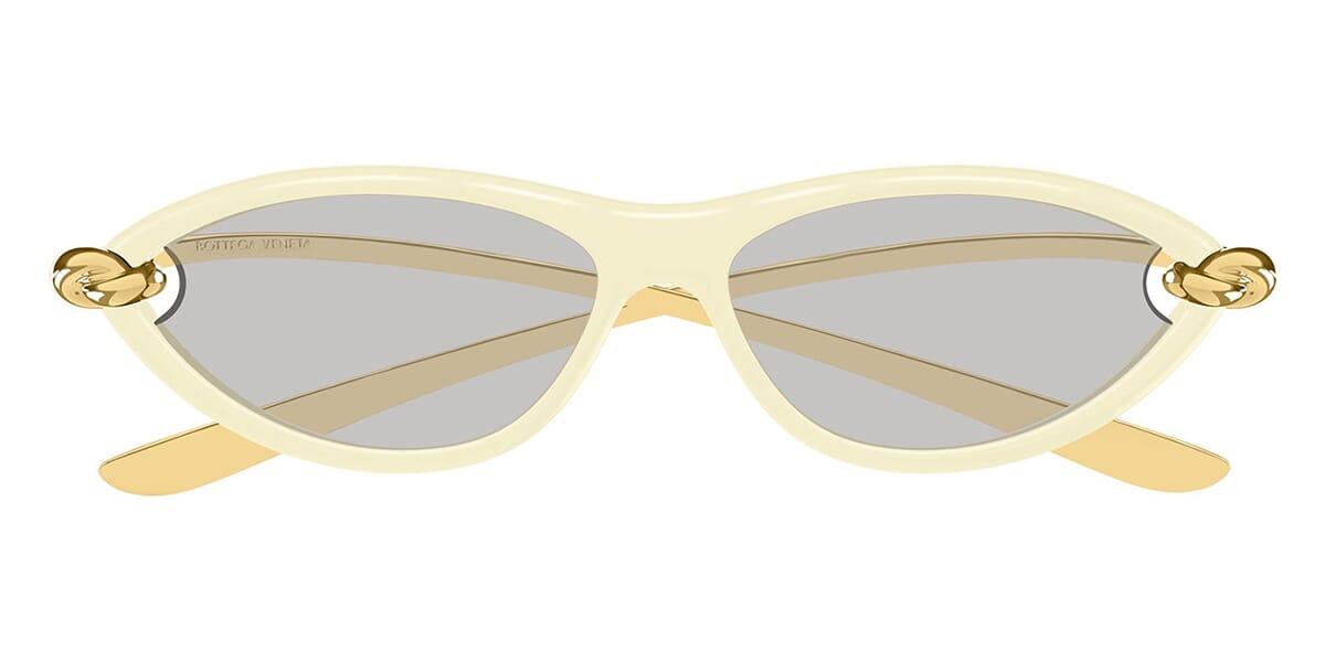 This cat eye Bottega Veneta sunglass comes in a beige and gold frame with grey lenses.