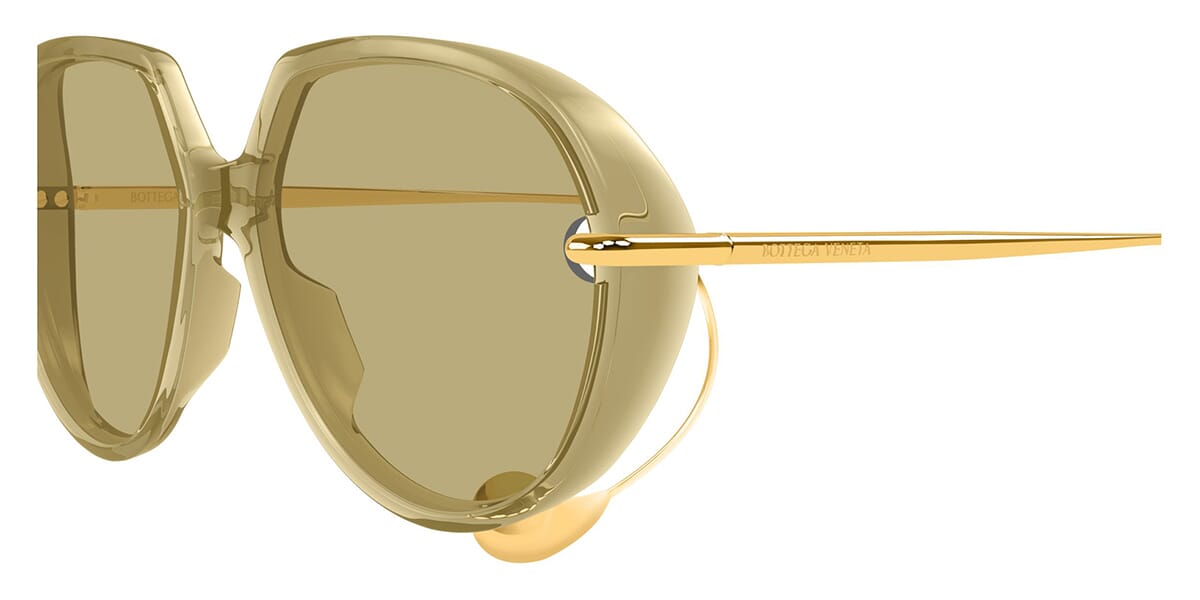This square Bottega Veneta sunglass comes in a shiny yellow crystal and gold frame with brown with light mirror lenses.