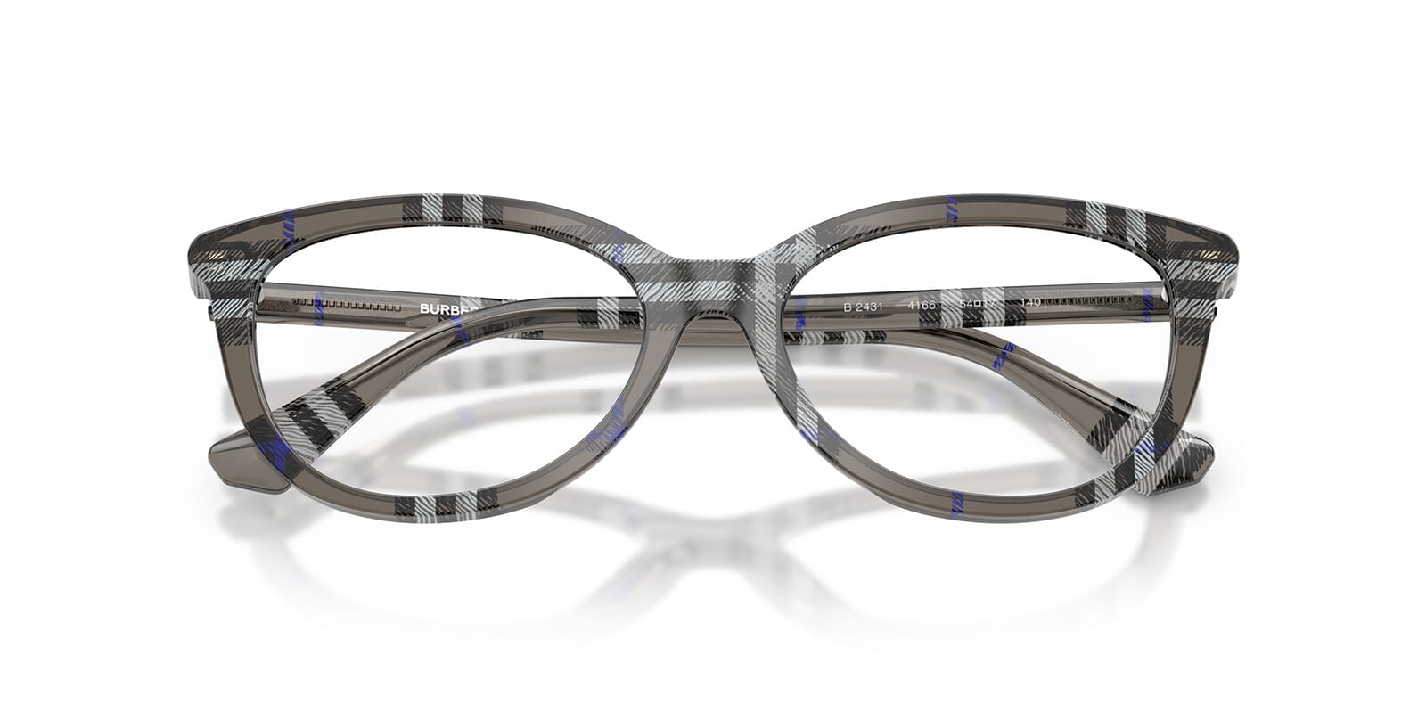 This cat eye Burberry optical comes in a check lichen frame.
