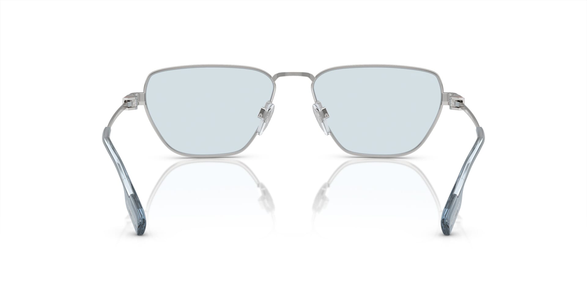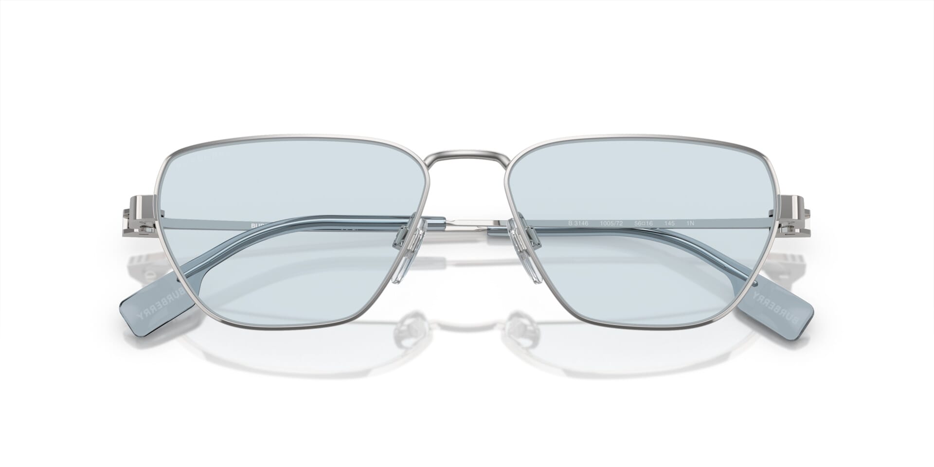 This square Burberry sunglass comes in a silver frame with light blue lenses.