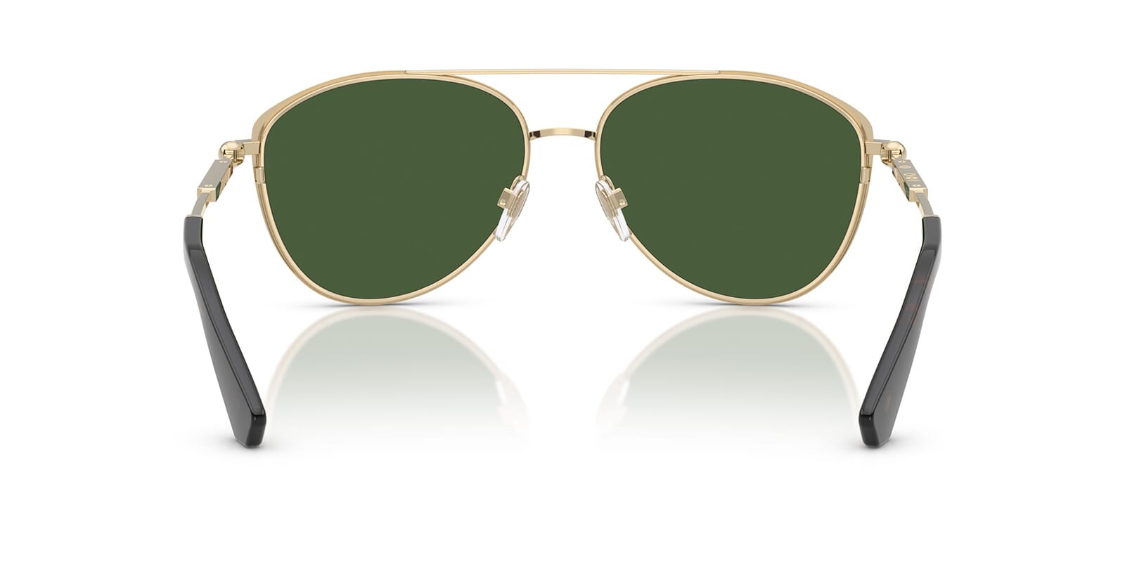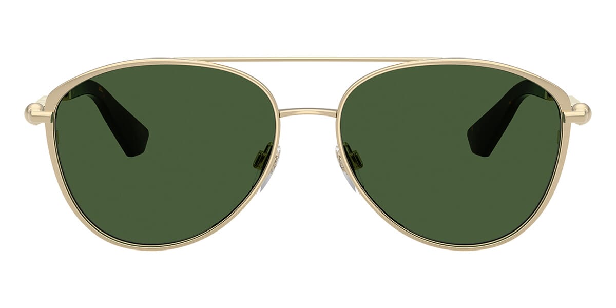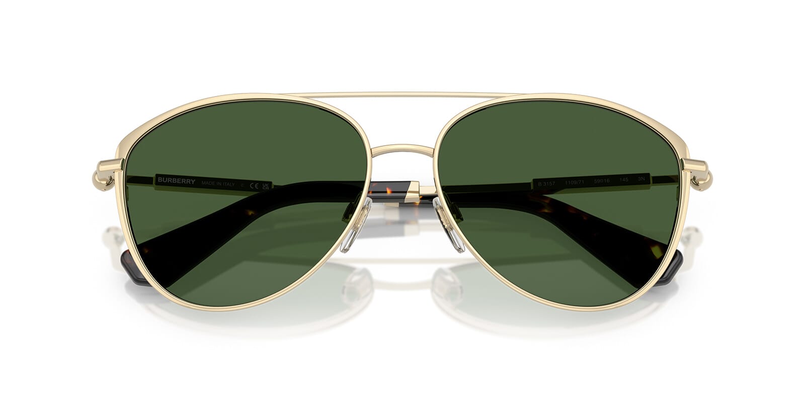 This aviator Burberry sunglass comes in a light gold frame with dark green lenses.
