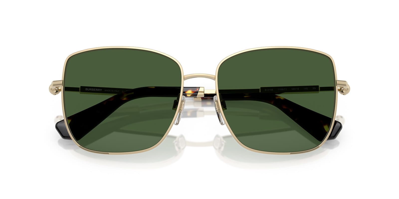 This square Burberry sunglass comes in a light gold frame with dark green lenses.