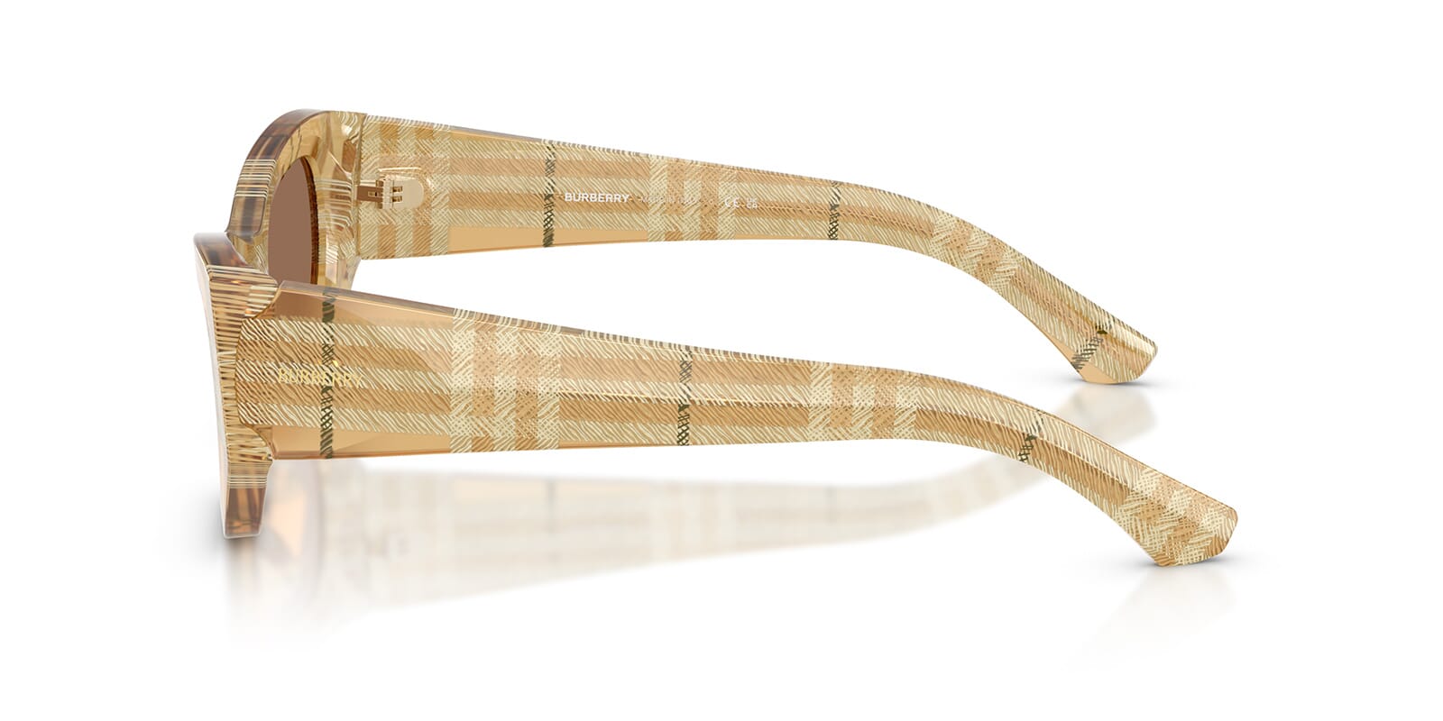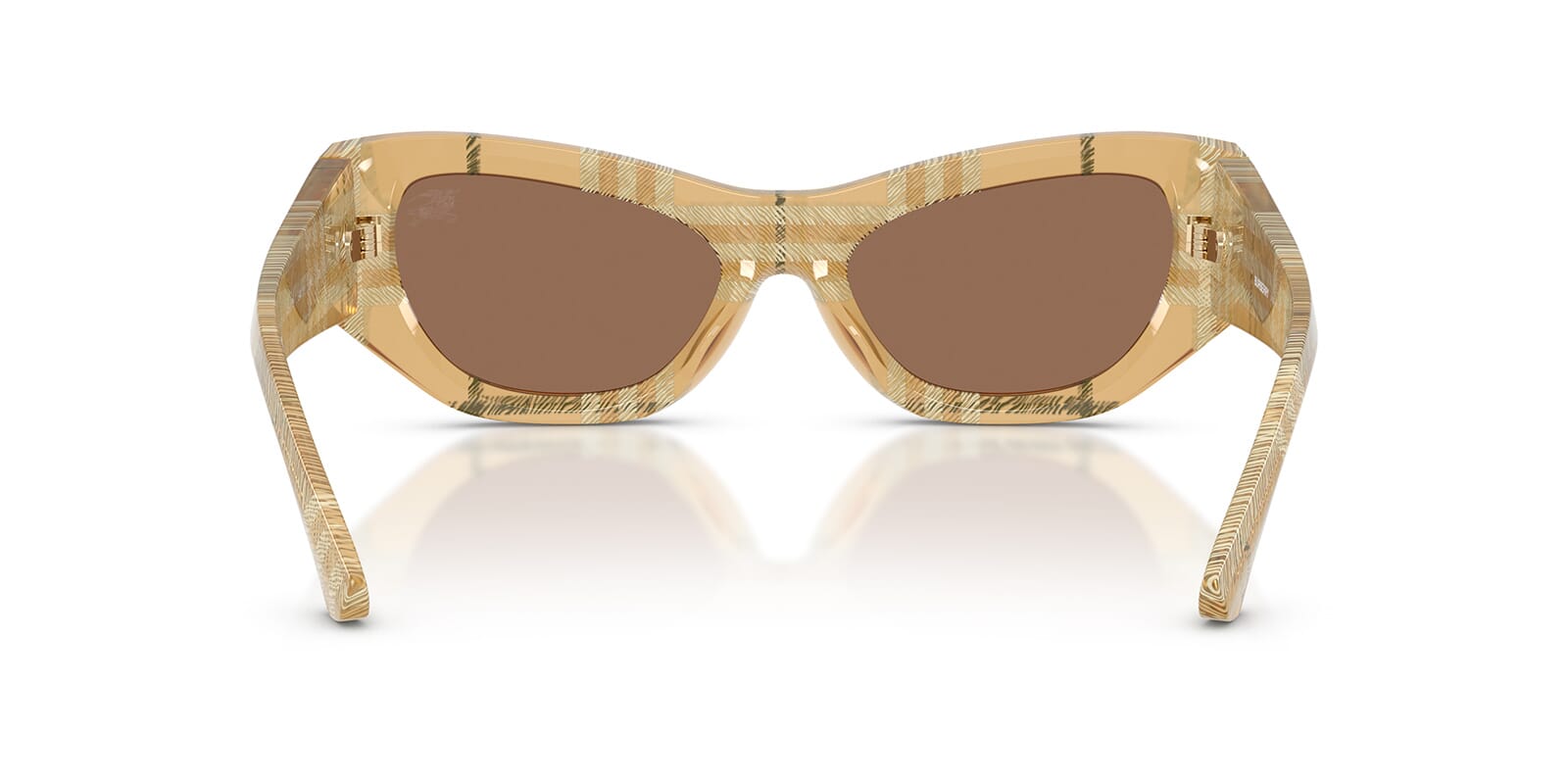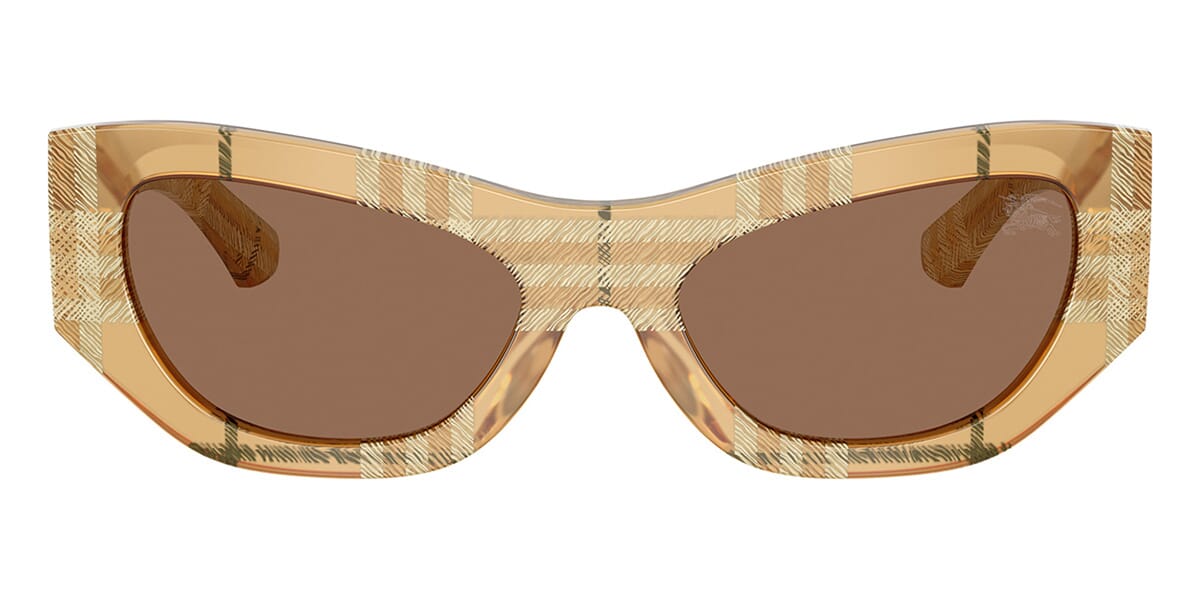 This cat eye Burberry sunglass comes in a check beige frame with dark brown lenses.