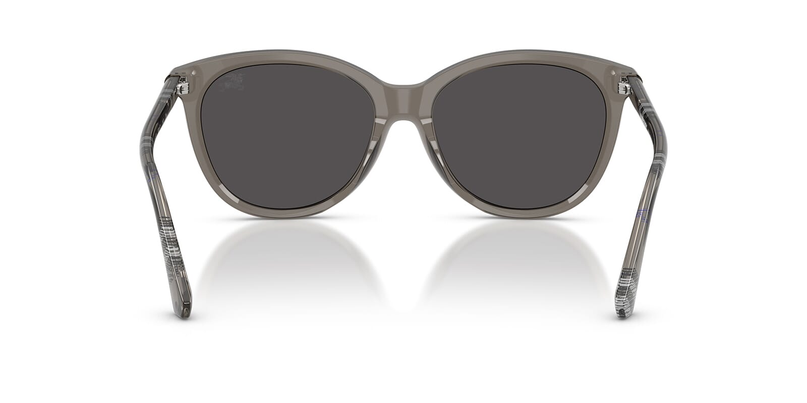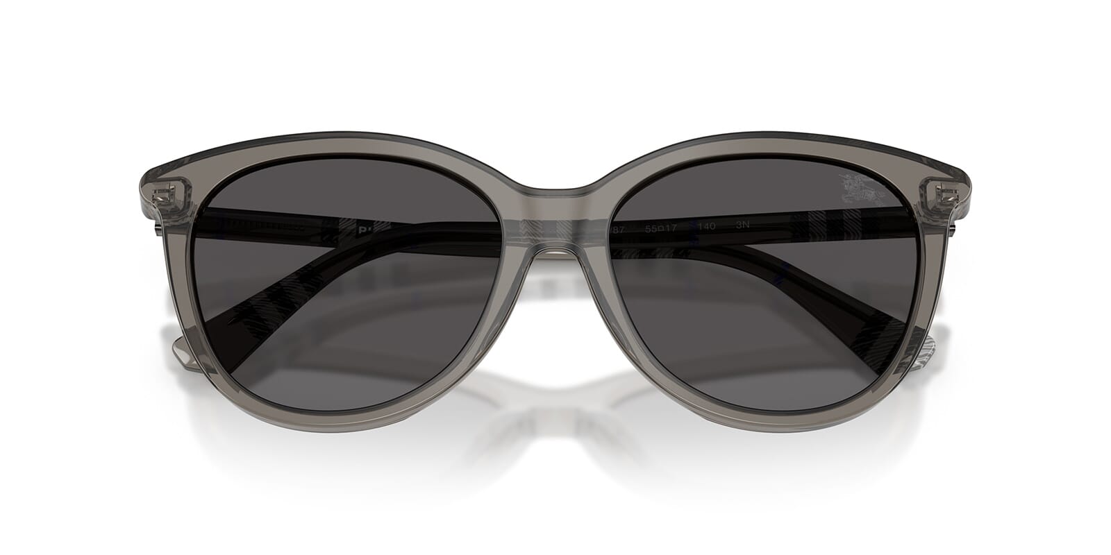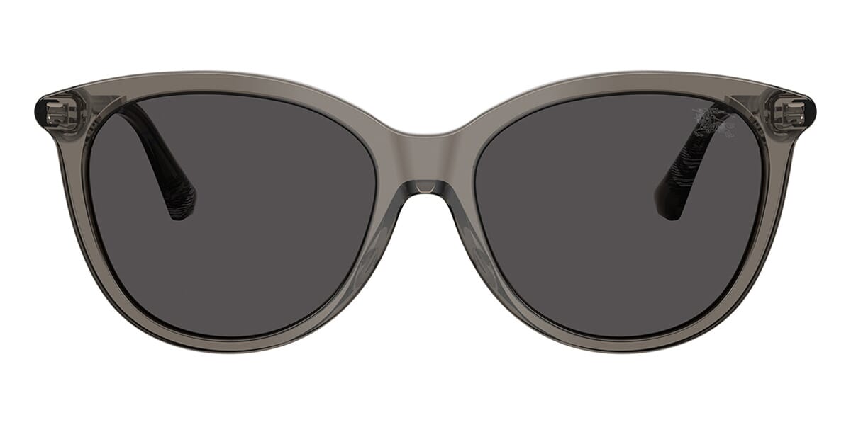 This round Burberry sunglass comes in a grey frame with dark grey lenses.