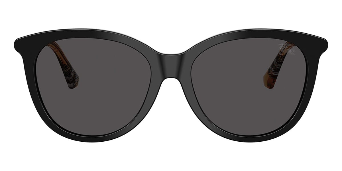 This round Burberry sunglass comes in a black frame with dark grey lenses.